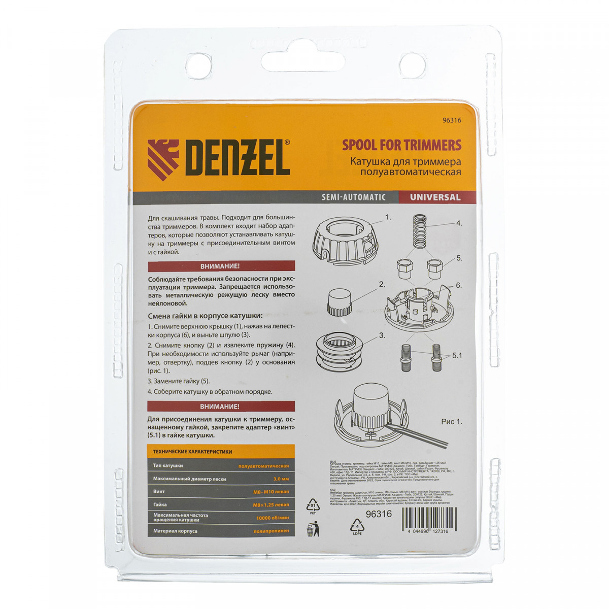 Универсальная триммерная катушка Denzel 96316 комплектуется адаптерами (гайка М10 х 1,25, гайка М8, винт М8-М10, левая резьба), поэтому совместима практически с любым электрическим и бензиновым триммером Denzel, оснащенным присоединительным винтом или гайкой. Также подходит к электро- и бензокосам от других производителей. Заправляется леской диаметром до 2,4 мм и позволяет решать большое количество задач: уход за газоном, скашивание сорняков, молодой поросли малины, старой и слежавшейся травы.