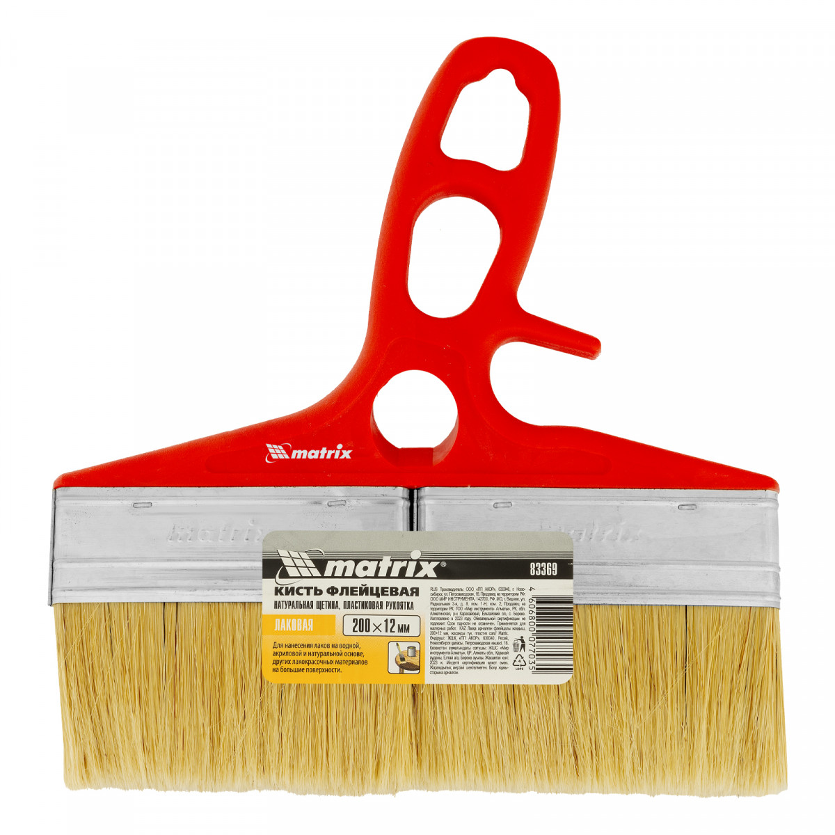 Флейцевая кисть для лаков Color Line Matrix 83369 шириной 200 мм и толщиной 12 мм, с натуральной щетиной и пластиковой ручкой, используется при отделке поверхностей лаковыми составами. Увеличенные размеры быстро обрабатывать участки большой площади. Натуральная светлая щетина расщеплена на концах, поэтому хорошо поглощает и отдает ЛКМ.
