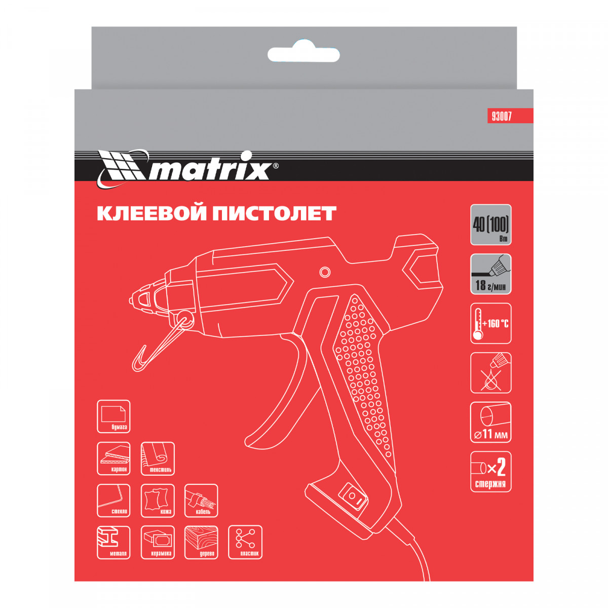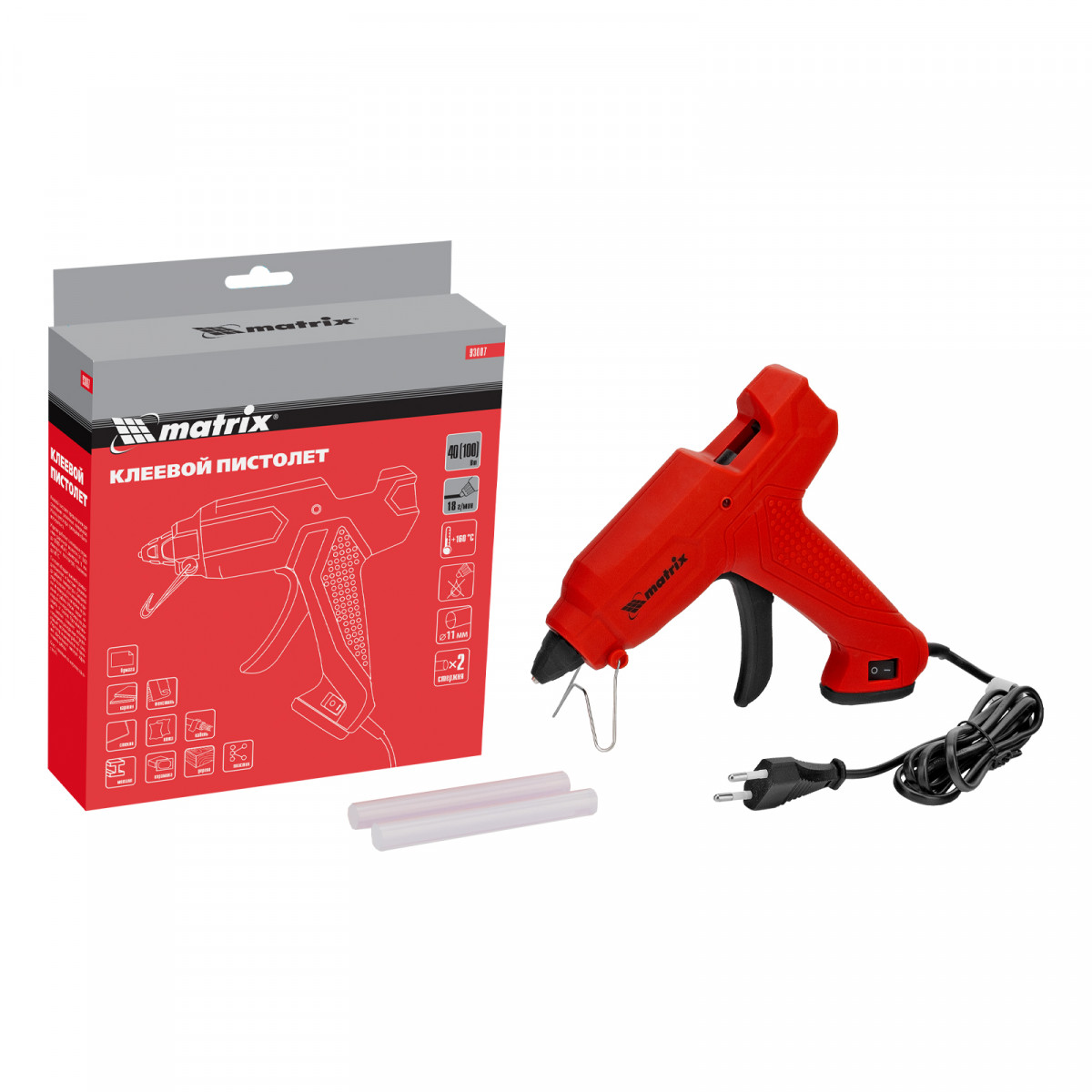 Клеевой пистолет, 11 мм, 40 (100) Вт, 18 г/мин, выключатель и индикатор напряжения Matrix