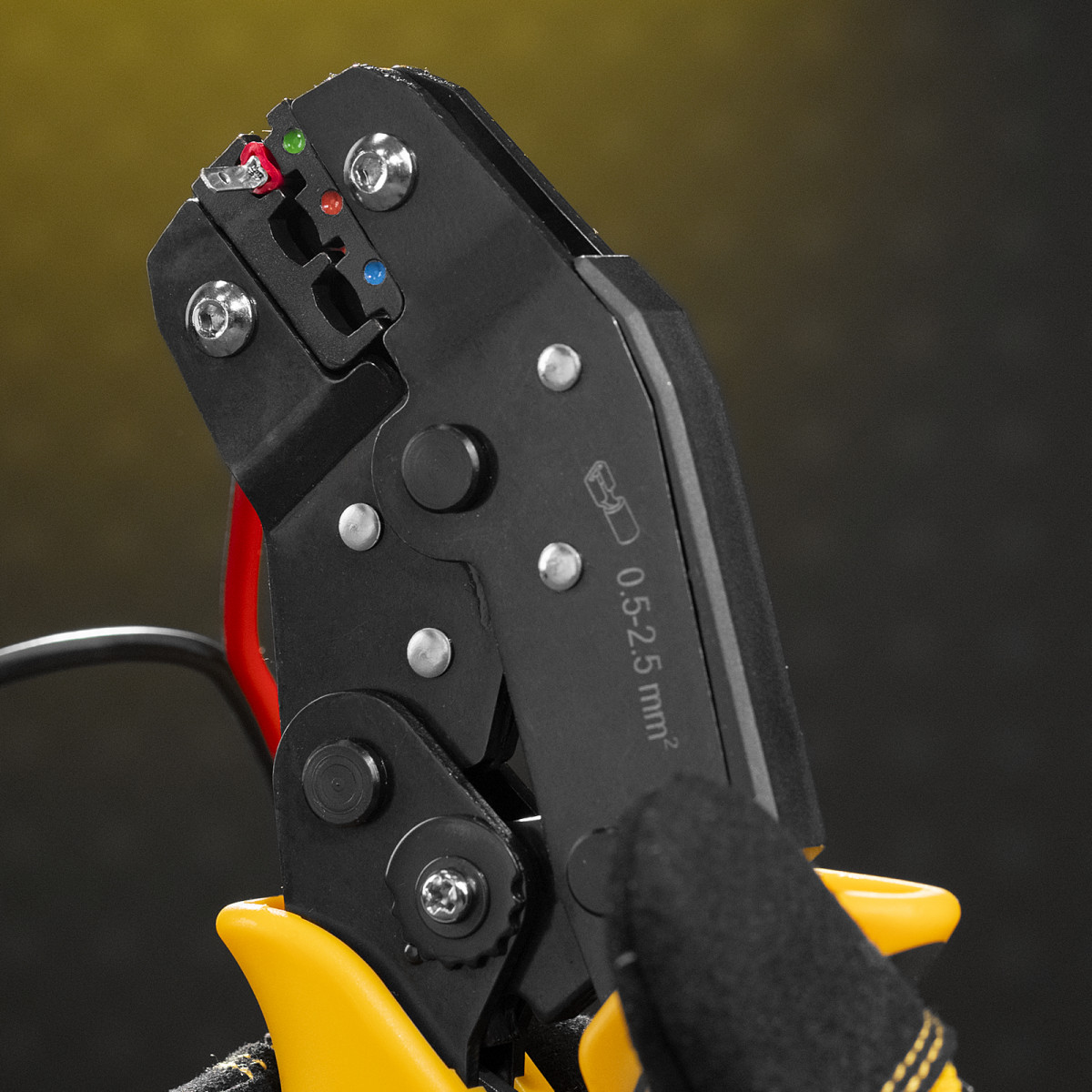 Клещи Denzel 17747 предназначены для обжима изолированных кольцевых наконечников НКИ и вилочных НВИ, разъемов плоских РПИ, гильз соединительных ГСИ сечением 0,5-2,5 мм². Инструмент пригодится частным и профессиональным мастерам при проведении электромонтажных работ.