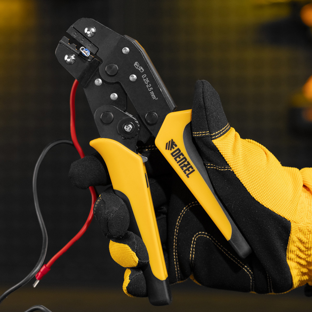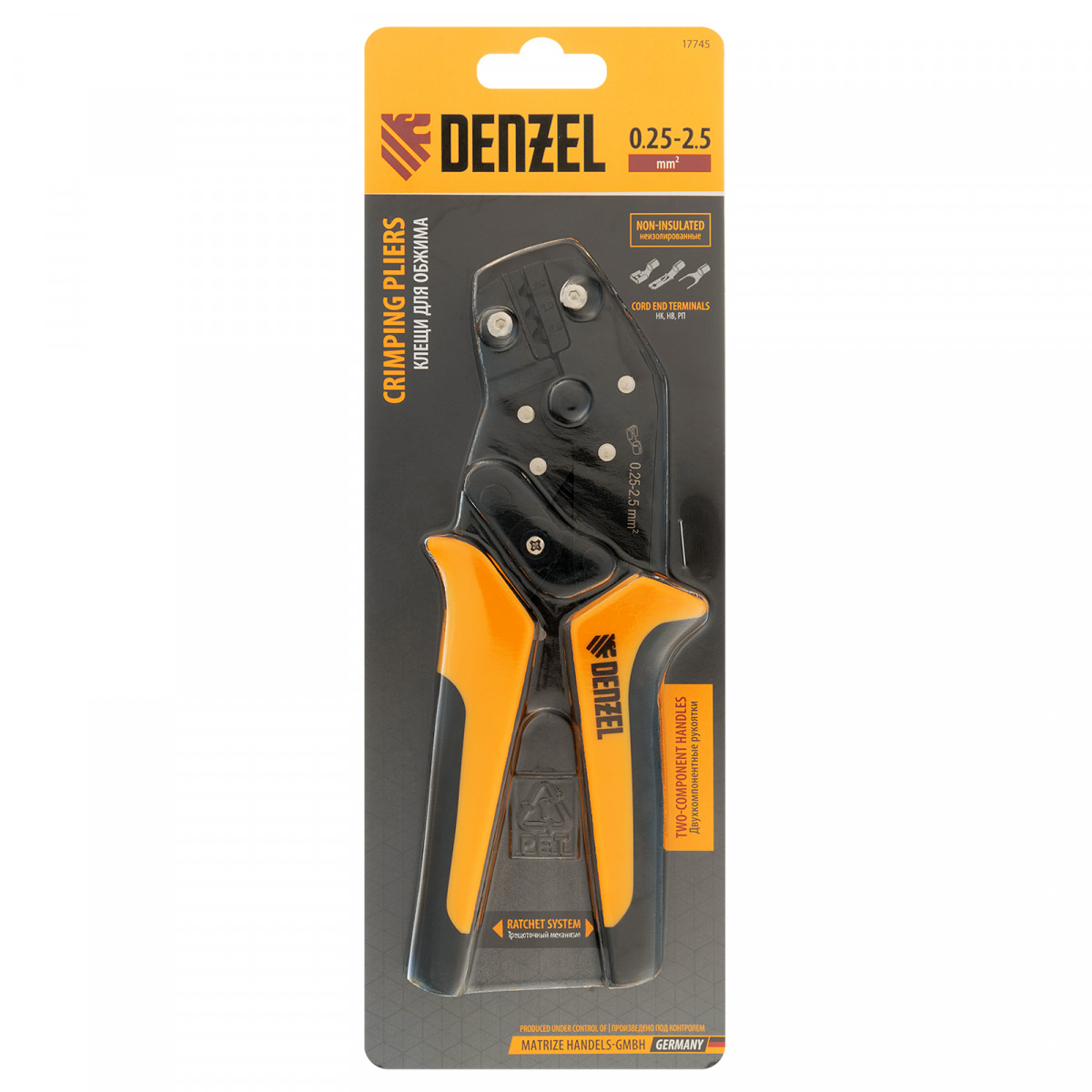 Клещи Denzel 17745 предназначены для обжима неизолированных наконечников кольцевых НК и вилочных НВ, разъемов плоских РП сечением 0,25-2,5 мм². Инструмент пригодится частным и профессиональным мастерам при проведении электромонтажных работ.