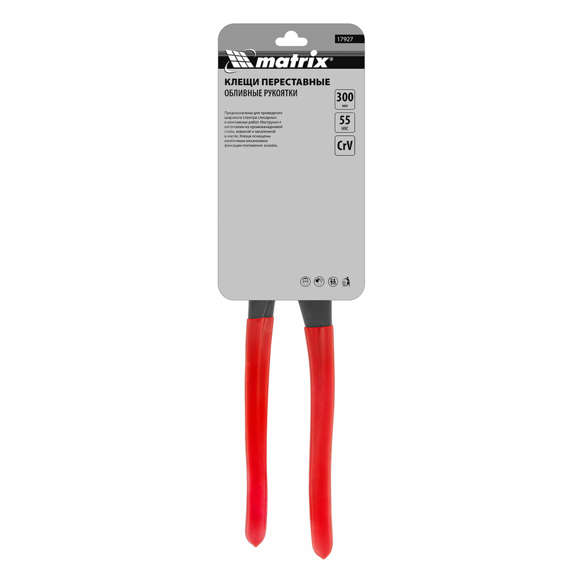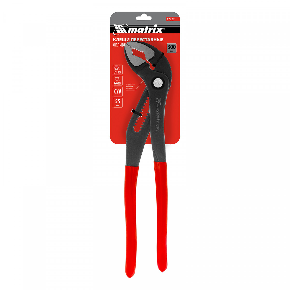 Переставные клещи Matrix 17927 длиной 300 мм, выполненные из хромованадиевой стали, с кнопочным механизмом и обливными рукоятками, используются для проведения монтажных и слесарных работ. Универсальный инструмент заменяет ключи различных размеров и применяется для фиксации заготовок, откручивания гаек, зажима и удержания труб диаметром до 64 мм.