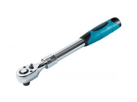Ключ телескопический трещоточный 1/2, 305-445 мм, CrV, хромир., 2-х комп. рукоятка //Gross. Для удобства работы ключ-трещотка оснащен запатентованным механизмом ступенчатой фиксации телескопической рукоятки. Изготовлен из хромованадиевой стали, трещотка – 72 зуба, реверс.