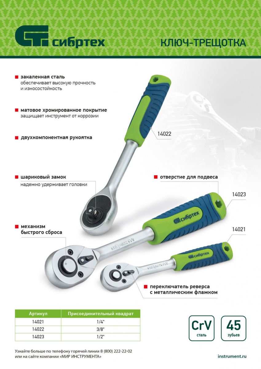 Ключ-трещотка Сибртех 14023 с присоединительным квадратом 1/2", функцией быстрого сброса и храповым механизмом с 45 зубьями, имеет покрытие «матовый хром» и используется с торцевыми головками, имеющими посадочное гнездо соответствующего размера. Предназначен для закручивания и раскручивания резьбового крепежа. Храповой механизм с 45 зубцами обеспечивает плавное вращение. Ключ применяется для ремонта автомобилей, техники и оборудования, пригодится также дома и на даче.