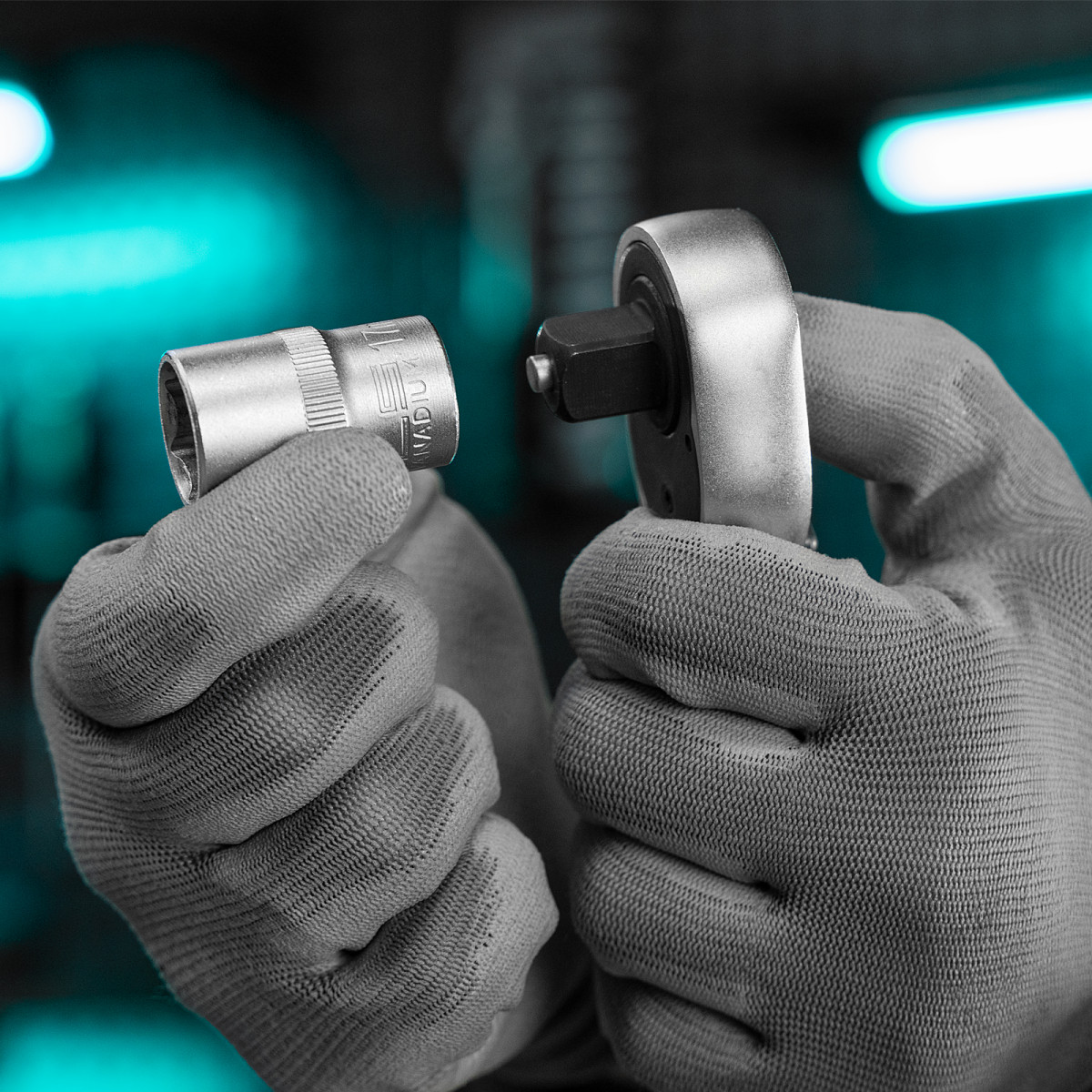 • Шариковый фиксатор — торцевые головки и другие насадки не соскакивают во время работы.