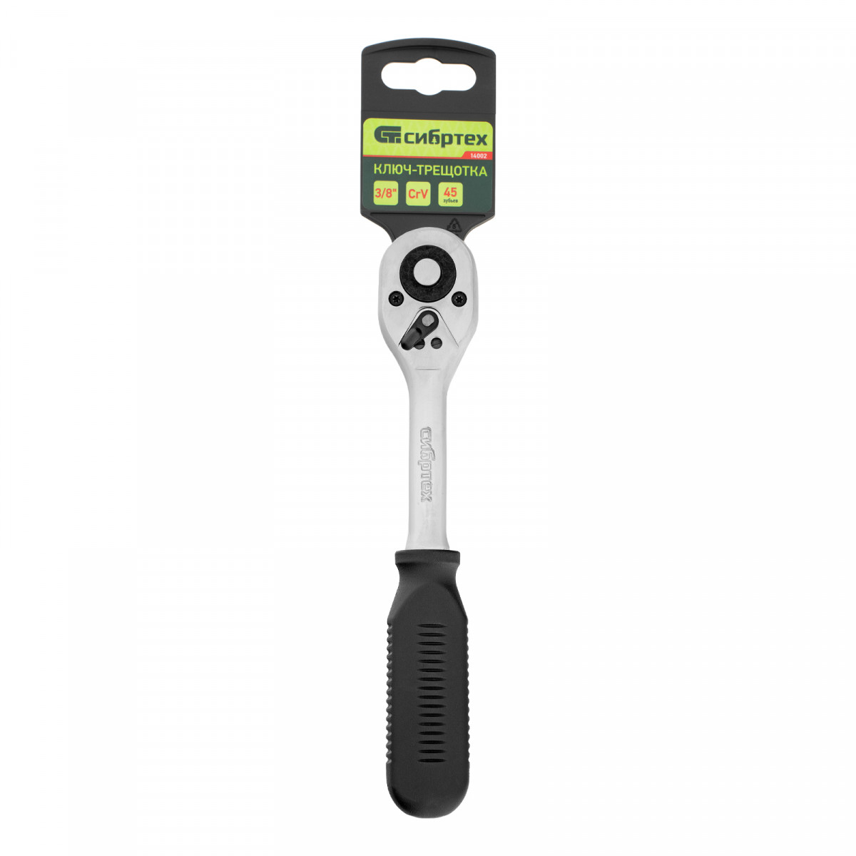 Хромированный ключ-трещотка Сибртех 14002 из стали CrV, с посадочным размером 3/8″ и 45-зубым храповым механизмом, с функцией быстрого сброса, используется для работы с резьбовым крепежом. Трещоточный механизм с 45 зубьями обеспечивает плавное вращение, облегчая работу. Инструмент пригодится дома, в мастерской и гараже.