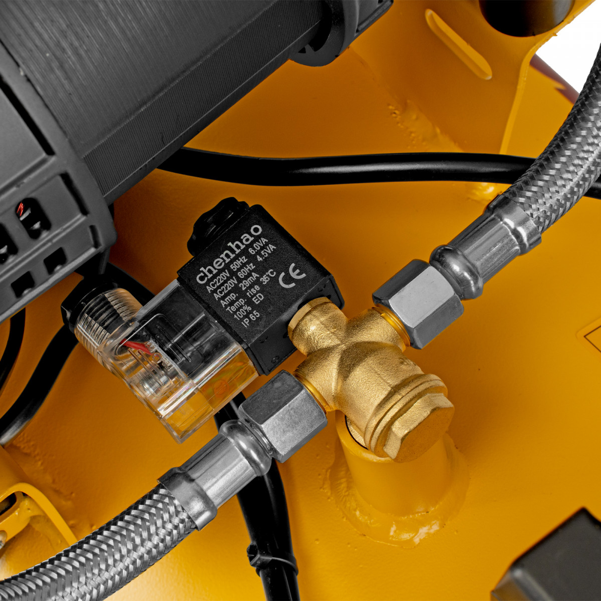 • Автономность — специальное реле останавливает компрессор по достижении максимального рабочего давления и запускает двигатель при падении давления до минимального уровня.