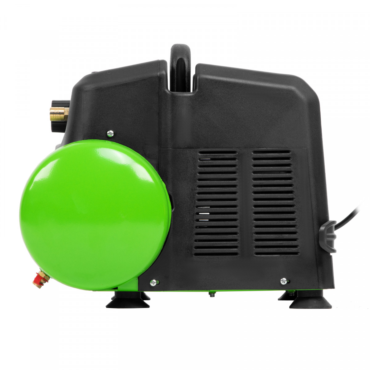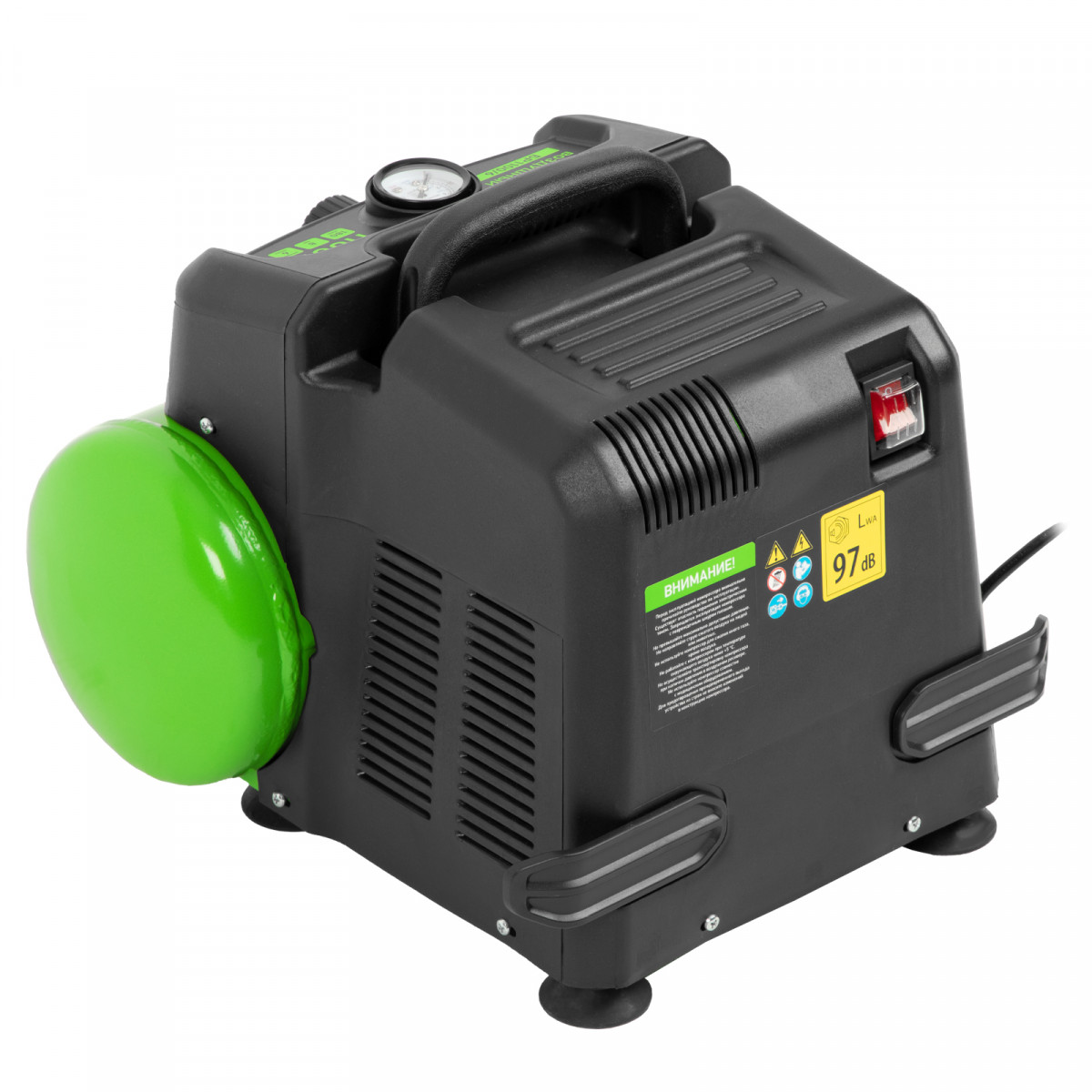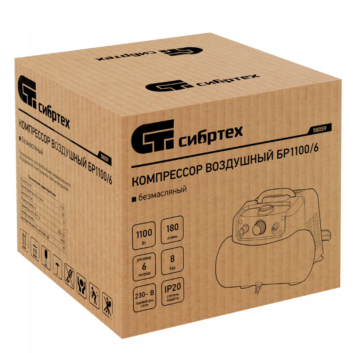 Воздушный безмасляный компрессор Сибртех BL 1100/6 58059 мощностью 1100 Вт, с ресивером емкостью 6 литров, служит для подачи сжатого воздуха под давлением до 8 бар со скоростью 180 л/мин. К нему можно подключить краскораспылитель, продувочный пистолет, заклепочник, пистолет для накачки шин и другой пневмоинструмент. Отсутствие масла делает компрессор оптимальным для выполнения покрасочных работ и продувки электронных компонентов. Устройство предназначено для бытового использования.,Одна из основных особенностей данной модели — компактность и удобство в перевозке. Компрессор отличается небольшим весом и дополнен эргономичной транспортировочной ручкой.