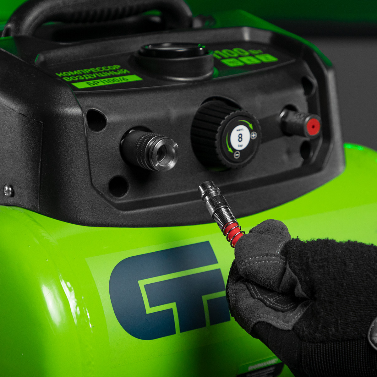 - Простая подготовка к работе — быстроразъемный выходной коннектор «Рапид» (евро) позволяет легко подключить пневмоинструмент.