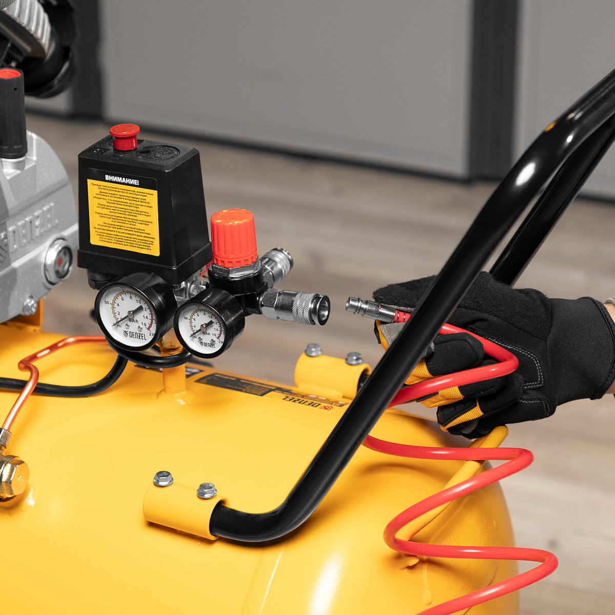 • Удобный контроль работы — 2 манометра позволяют следить за давлением в ресивере и на выходе компрессора.