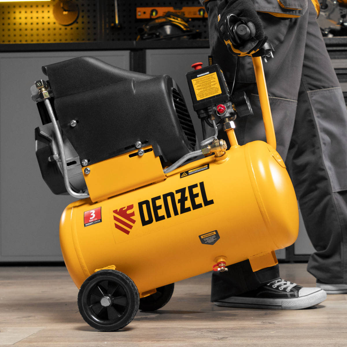 • Мобильность — компрессор, оснащенный ручкой и колесами, весит 22,6 кг, что упрощает его транспортировку.