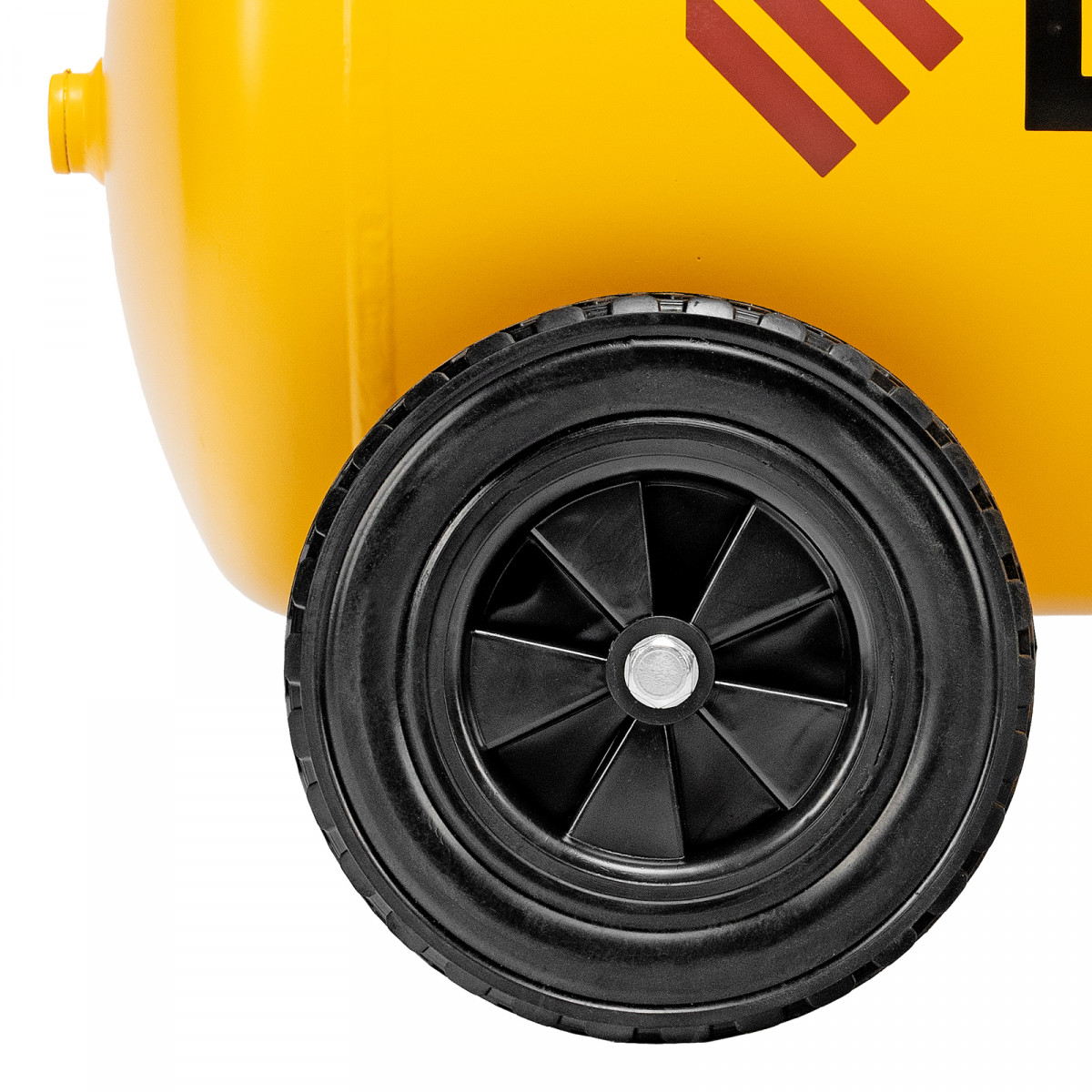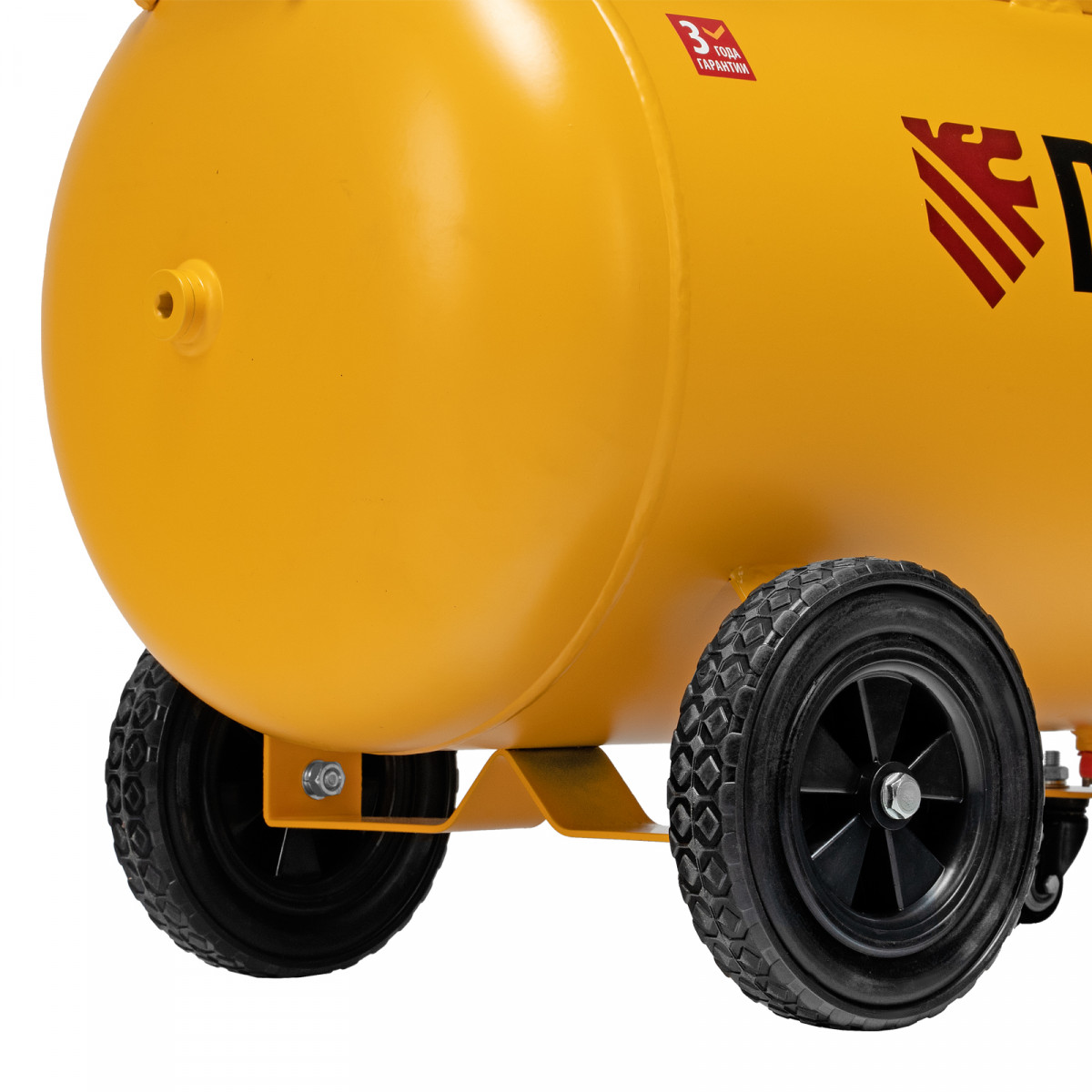 • Удобная транспортировка — на компрессоре установлены колеса, в т. ч. поворотные, и П-образная рукоятка.