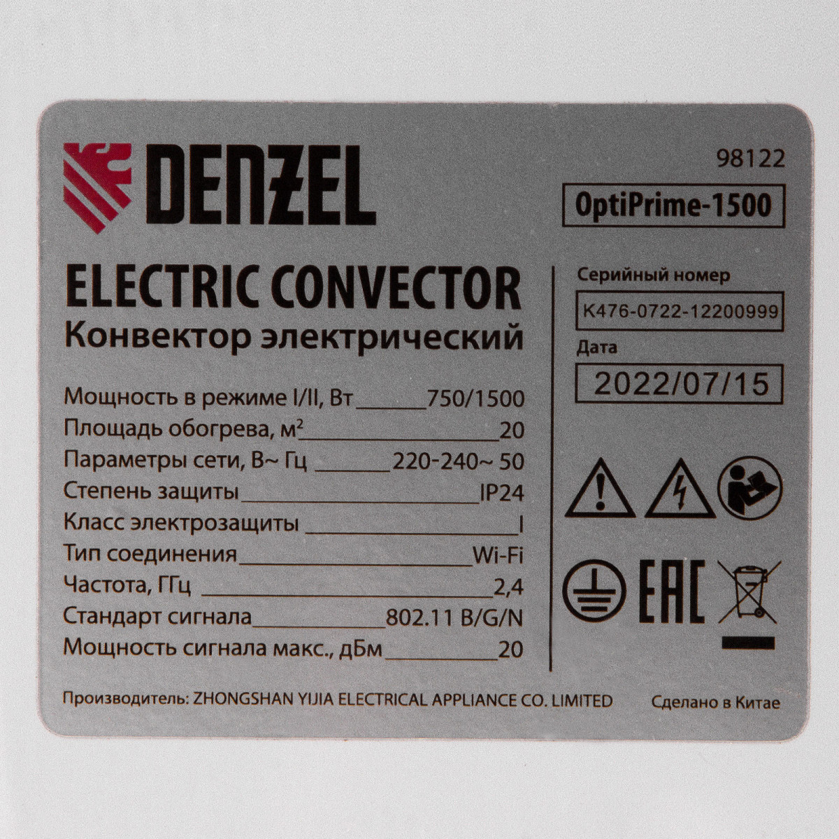 Электрический конвектор Denzel OptiPrime-1500 98122 максимальной мощностью 1500 Вт, с тачскрином, цифровым термостатом и функцией подключения к Wi-Fi, рассчитан на обогрев квартиры, дачи, загородного дома, офиса, а также пригодится в производственных, бытовых и общественных помещениях. Рекомендуемая площадь обогрева — 20 кв.м. Две мощности обогрева 750 и 1500 Вт позволяют поддерживать температуру в отапливаемой комнате и полностью прогревать холодные помещения.,Устройство оснащено Х-образным нагревательным элементом — самым долговечным среди аналогов, обеспечивающим максимально равномерный прогрев помещения. Конвектор не сушит воздух, не сжигает пыль и исключает появление неприятного запаха.