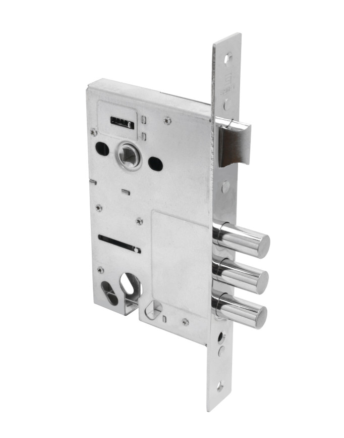 Корпус врезного цилиндрового замка Булат с тремя ригелями и защелкой предназначен для установки во входные и технические металлические двери.