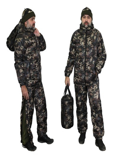 Утепленный костюм предназначен как для повседневного ношения, так и может выполнять роль дополнительного защитного слоя одежды. За счет индивидуального компрессионного мешка занимает мало места, а малый вес позволяет брать его с собой даже в пешие многодневные походы. Костюм состоит из удлиненной куртки и брюк. Куртка имеет 2 прорезных нижних кармана, 1 нарукавный карман и 1 внутренний карман. Капюшон регулируется по лицевому шву. Манжет рукава имеет эластичную утяжку и фиксируется патой. - Брюки в боковом шве по всей длине имеют молнию для облегчения надевания поверх одежды. Молния сверху и снизу фиксируется патой для защиты от случайного открытия. Пояс имеет эластичную стяжку и шлевки под ремень. Манжет брюк на эластичной стяжке. Температурный режим: -15 экстрим