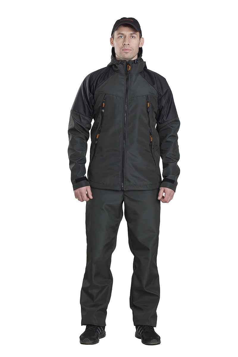 Практичный мужской костюм для прогулок по городу для активного отдыха на природе. Из современной трехслойной ткани ПОНЖИ. Ткань прочная и дышащая, с водоотталкивающим покрытием, быстро сохнет и обеспечивает воздухообмен. На плечах накладки из ткани повышенной прочности и влаго-ветрозащиты - Кошачий глаз. В этой куртке вы будете чувствовать себя защищенным от любой непогоды. Куртка на молнии удлиненная сзади с четырьмя карманами в рельефах, и утяжками по низу изделия удобно сядет по фигуре. Капюшон с регулировкой по объему и глубине зищитит лицо от влаги и ветра. Брюки сзади с небольшой спинкой для защиты спины от холода.