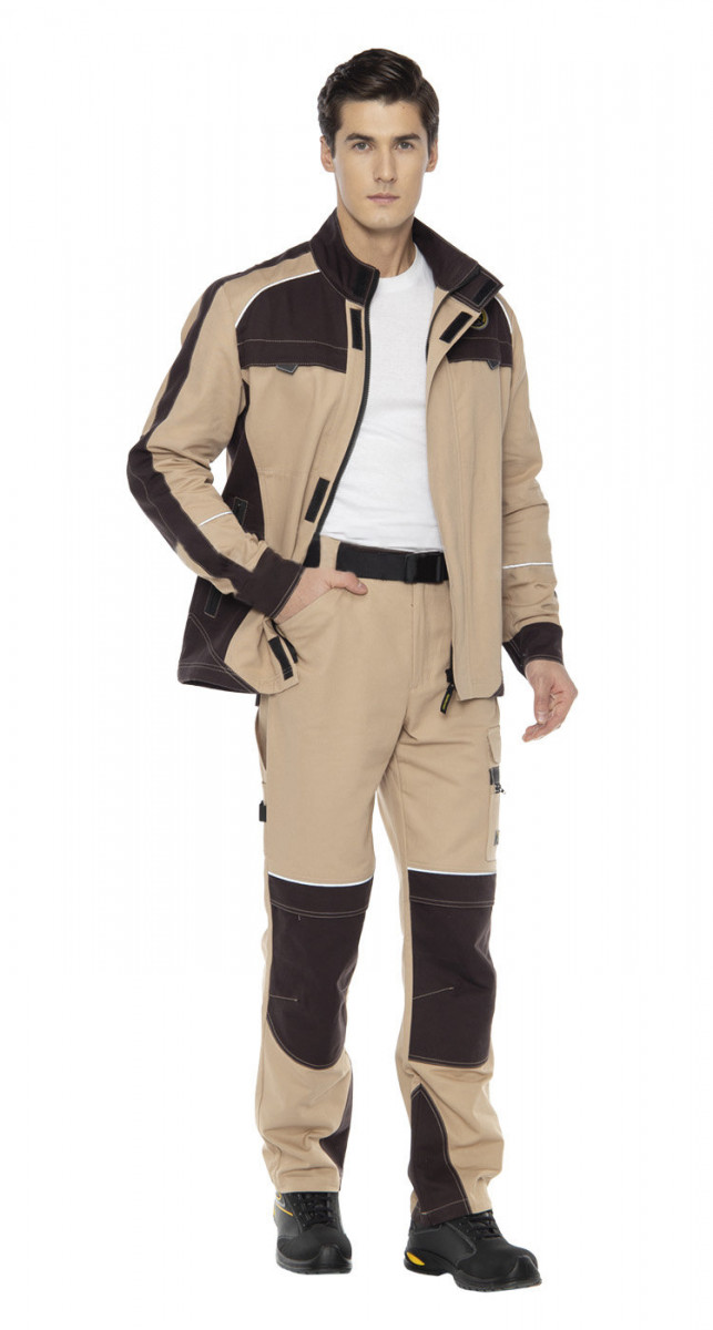 Брюки эргономичной формы с застежкой на молнию и металлическую пуговицу. Пояс с широкими шлевками, в том числе из стропы, и с полукольцом. На передних половинках верхние боковые карманы и карманы на коленях для амортизационных вкладышей. На задних половинках сложная кокетка, верхние накладные карманы и карманы для инструментов. На левой брючине в области середины бедра накладной карман с клапаном и отделом на молнии. Съемный пояс из ременной стропы на пластиковой пряжке. Световозвращающие канты на рукавах и кокетках куртки, над коленями и на кокетке брюк.