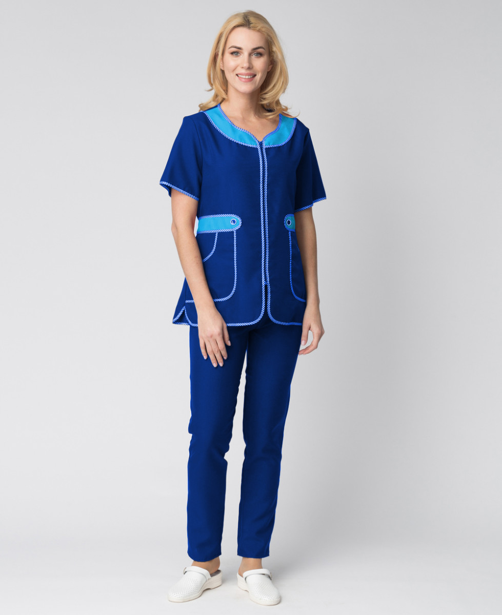 -КУРТКА: -укороченная, прямого силуэта с коротким рукавом и центральной застежкой на молнии -фигурный вырез горловины и верхний срез карманов декорированы отделочными деталями из контрастной ткани -спинка прямая без отделки, с двумя полупоясами для регулировки объема -все срезы костюма окантованы капроновым кантом -для увеличения прочности куртки выполнено дополнительное усиление швов центральной застежки БРЮКИ: -прямые -на резинке