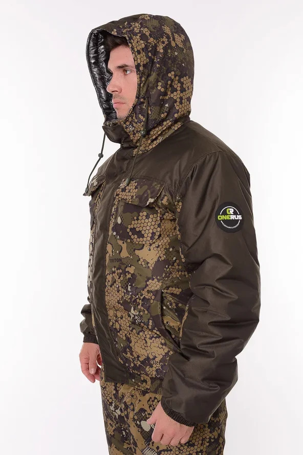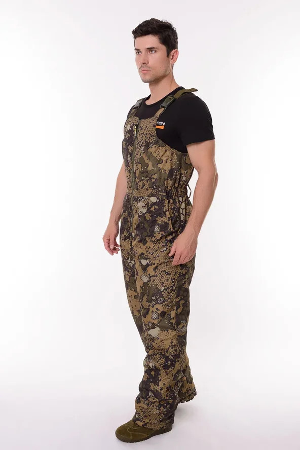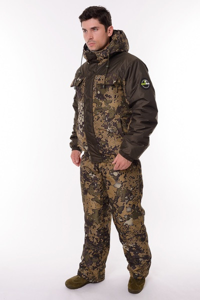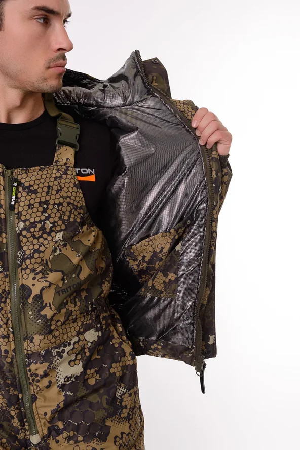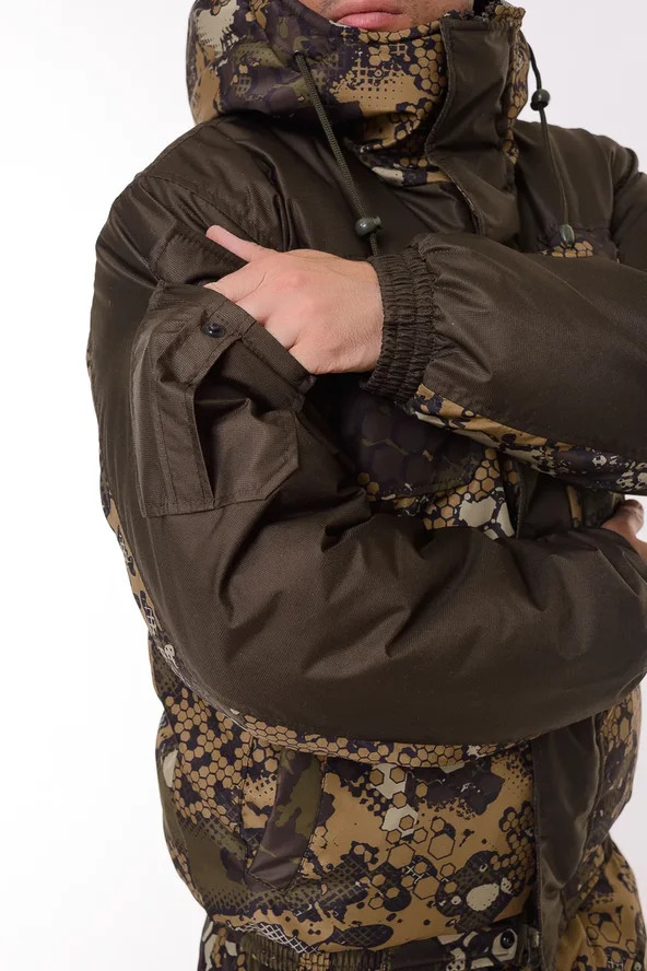 Основная ткань Дюспа Утеплитель Синтепон 350 г/м² Подклад фольгированный Мембрана 3000/3000 Съемный капюшон Капюшон и воротник отделаны флисом Трикотажные манжеты на рукавах + утяжка липа Молнии расширители по низу брюк + планка на липе Утяжка по низу куртки Лямки подтяжки типа горка, с перекрестием в области лопаток
