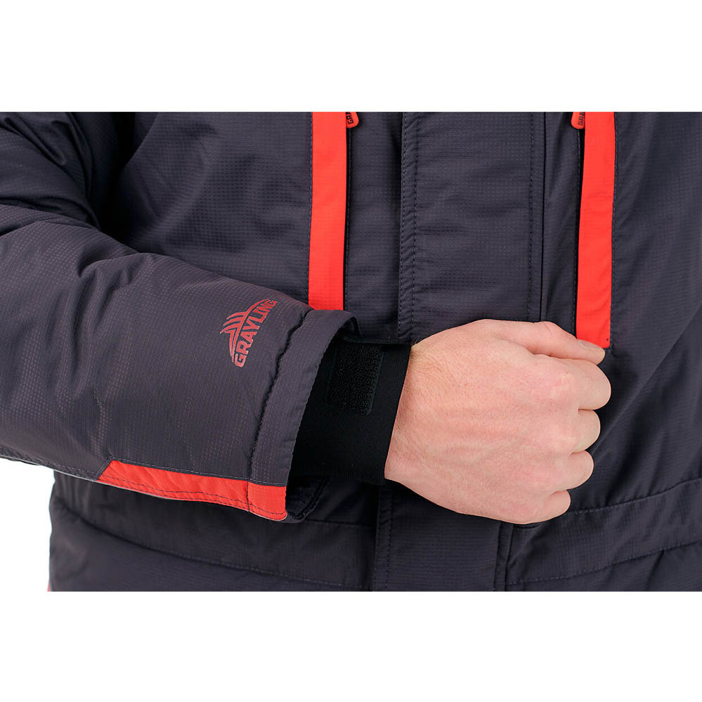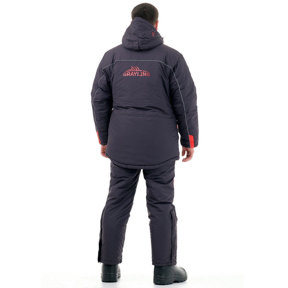 Куртка прямого силуэта удлинена по спинке, закрывается на двухзамковую молнию и ветрозащитную планку на липучках и кнопках. Нагрудные и нижние карманы с флисовым подкладом на молниях защищены листочками контрастного цвета. Внутренний карман для документов на молнии. Имеется также дополнительный карман для телефона под ветрозащитной планкой, утепленный флисом. Куртка регулируется по талии внутренней кулиской утяжкой из шляпной резинки с фиксаторами. Рукава дополнены регулируемыми неопреновыми манжетами. Высокий воротник утеплен флисовым подкладом. Съемный капюшон регулируется по высоте патой на липучке, по овалу лица – шляпной резинкой с фиксаторами. На груди имеется D-образное кольцо для подвешивания инструмента. Крупные пуллеры-кольца дают возможность расстегивать карманы не снимая перчаток. Высокие брюки-полукомбинезон регулируются по высоте эластичными бретелями. Пояс брюк на спинке собран на широкую резинку, дополнен шлевками. Застегивается комбинезон на двухзамковую молнию с планкой на липучках.
