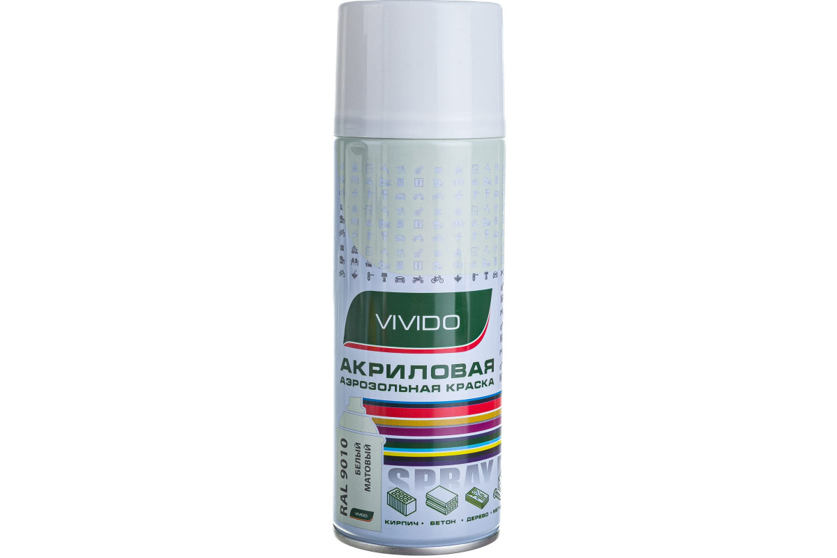 Акриловая аэрозольная краска Vivido белый матовый RAL 9010 VI9010 предназначена для высококачественного окрашивания деревянных, металлических, пластиковых, каменных, бетонных, керамических и др. поверхностей. Служит для обработки различного оборудования, приборов, мебели, оконных рам, дверей, дверных ручек, элементов сантехники, инструментов, предметов декора, изделий ручной работы, автомобилей, мотоциклов и прочего.
