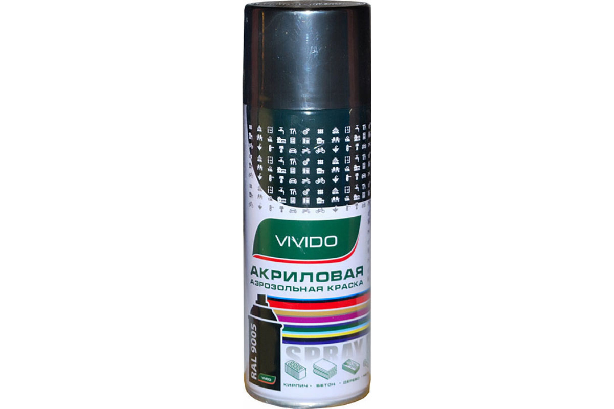 Акриловая аэрозольная краска Vivido черный матовый RAL 9005 VI9005m предназначена для высококачественного окрашивания деревянных, металлических, пластиковых, каменных, бетонных, керамических и др. поверхностей. Служит для обработки различного оборудования, приборов, мебели, оконных рам, дверей, дверных ручек, элементов сантехники, инструментов, предметов декора, изделий ручной работы, автомобилей, мотоциклов и прочего.Благодаря составу, цвет покрытия не желтеет и не выцветает. Средство обладает стойкостью к вредным факторам окружающей среды (покрытие не растрескивается от перепада температуры), поэтому может применяться для внутренних и наружных работ. Аэрозольная краска на акрило-эпоксидной основе, не содержит свинца и ртути, безопасна для окружающей среды.Покрытие надежно защищает поверхности от окисления и ржавчины, пригодна как для полного окрашивания поверхностей, так и для частичного.