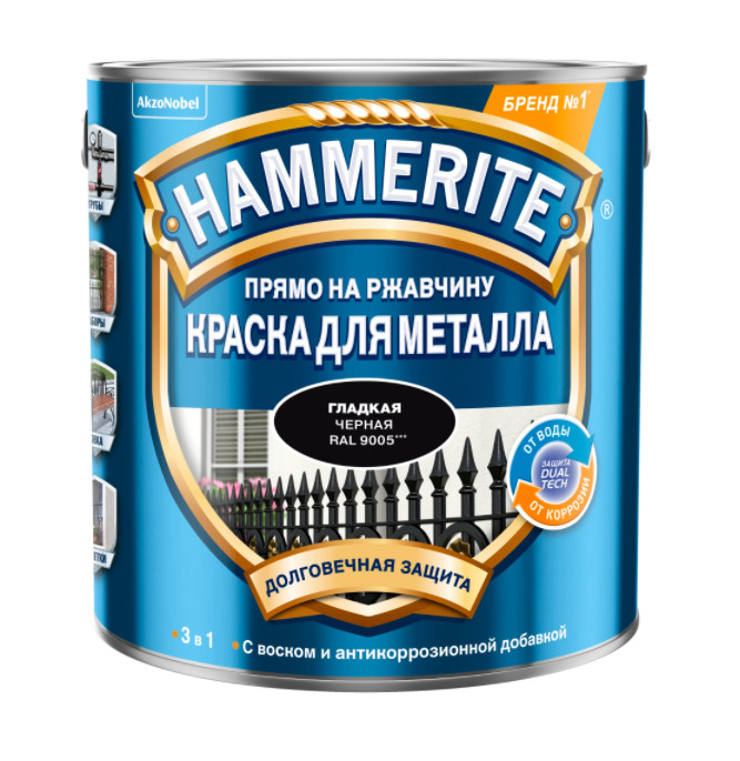 Краска для металла гладкая Hammerite (черный цвет) является защитно-декоративным составом. Наносится прямо на ржавчину, создает долговременную (до 8 лет) защиту изделий из черных металлов. Состав быстро высыхает и образует эластичное водо- и грязеотталкивающее глянцевое покрытие. Применяется внутри и снаружи помещений.