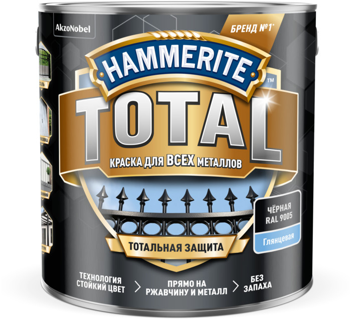 Краска Hammerite Total глянцевая чёрная RAL 9005 2,2л