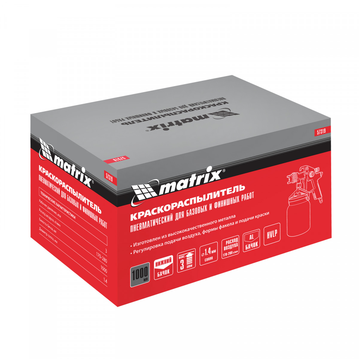 Пневматический краскораспылитель с нижним бачком Matrix 57319 объемом 1 л, с соплом диаметром 1,4 мм, расходует 170-280 л воздуха в минуту и предназначен для выполнения окрасочных работ. Позволяет работать с лакокрасочными материалами разных типов и консистенции. Благодаря технологии HVLP (High Volume Low Pressure, высокий объем, низкое давление) на поверхность переносится до 65% ЛКМ, что обеспечивает высокую производительность и сокращает потери краски. Краскораспылитель пригодится в мастерской, в гараже и в автосервисе.
