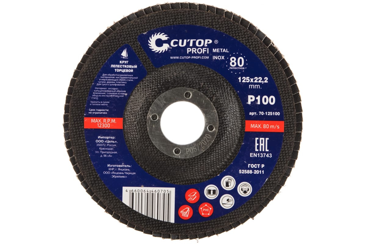 Круг наждачный лепестковый Cutop 70-125100 используется для профессионального и повседневного использования. Абразивный материал - кальценированный оксид алюминия, 80 лепестков, угол наклона 10 градусов, 100% КПД, повышенная износостойкость.