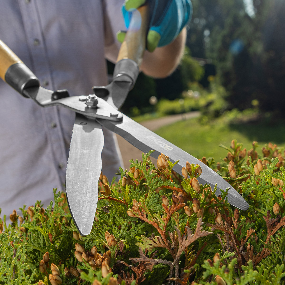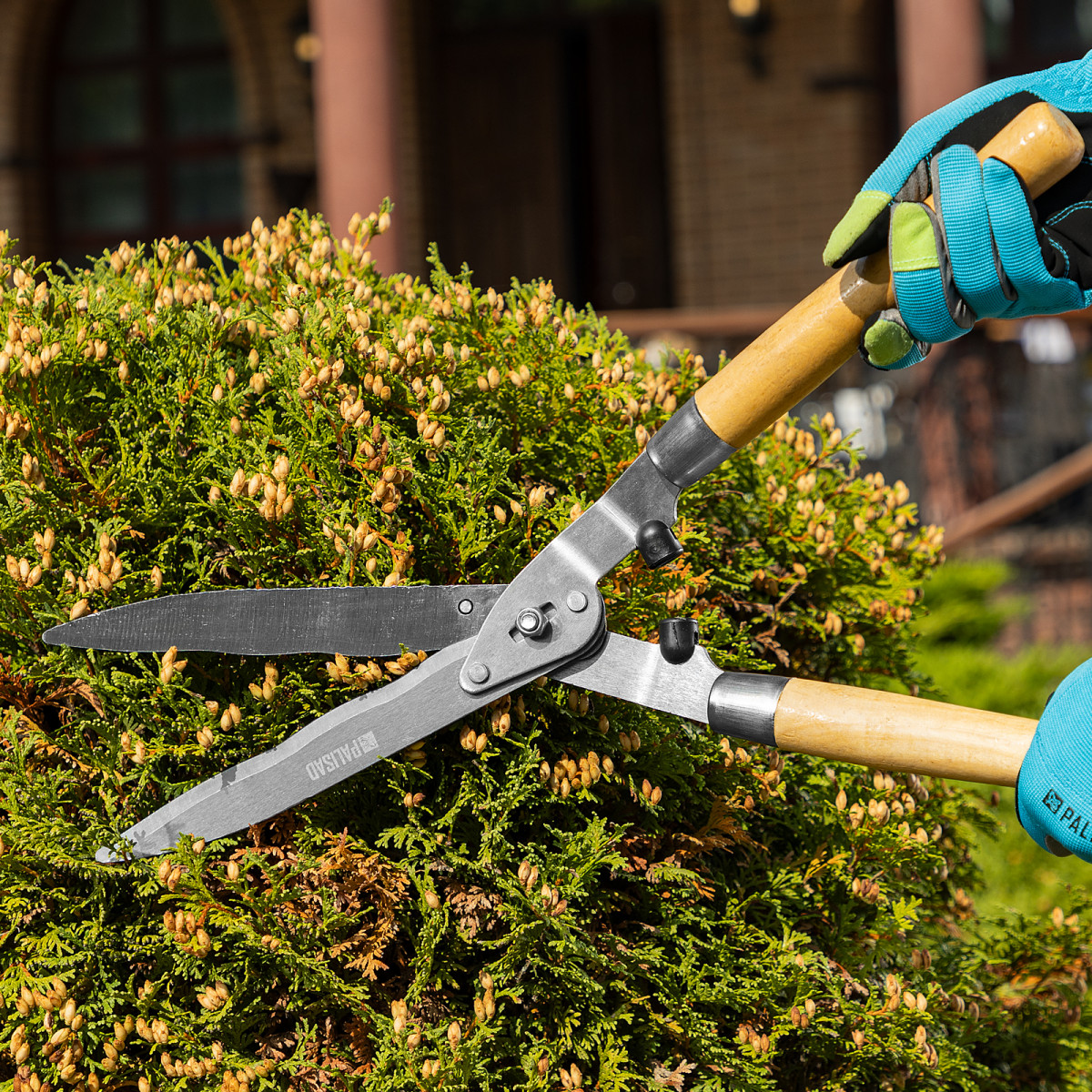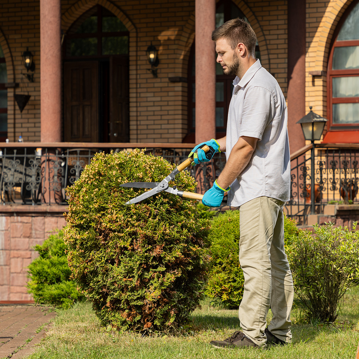 Кусторез Palisad 608375 длиной 520 мм, с волнистыми лезвиями и деревянными рукоятками, легко справляется с обрезкой молодых веток диаметром до 10 мм. Волнистые лезвия оптимальны для срезания веток с гладкой корой. Кусторез будет полезен садоводам, т. к. позволяет поддерживать кустарники и живые изгороди в аккуратном виде.