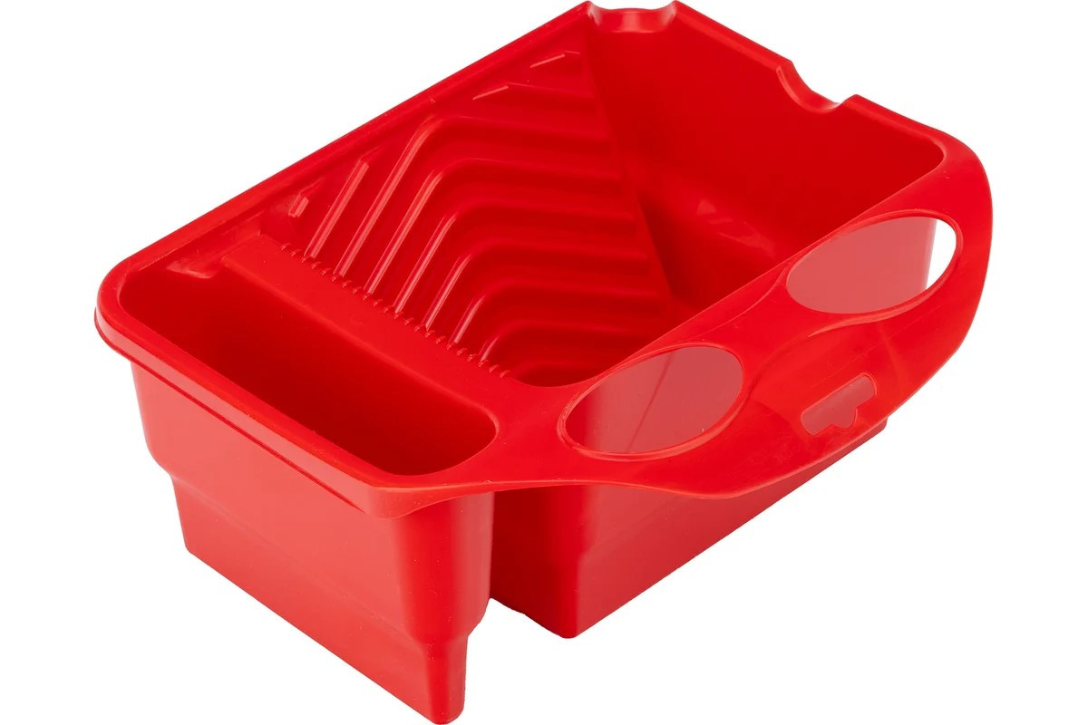 Ручная пластмассовая кювета для кистей и мини-валиков — многофункциональная емкость, существенно облегчающая процесс нанесения лакокрасочных материалов. Эргономика кюветы позволяет прочно удерживать ее в руке и работать со всеми типами ЛКМ в труднодоступных местах, при этом можно пользоваться сразу несколькими малярными инструментами: мини-валиками и кистями.* ПреимуществаПродуманная конструкция — в емкости предусмотрены специальные поверхности для раскатки валиков, очистки кистей, слива избыточной краски, а также есть лоток для хранения малярного инструментаКомфортная эксплуатация — кювету удобно держать одной рукой при выполнении малярных работ, в том числе и на высотеНадежность и простой уход — кювета изготовлена из ударопрочного полипропилена, устойчива к интенсивным нагрузкам и легко моетсяУдобное хранение — отверстие в кювете позволяет подвешивать ее