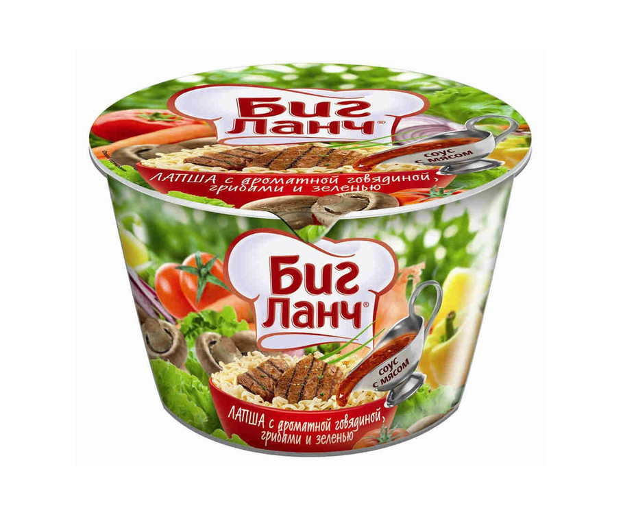 Лапша «Биг Ланч» с ароматной говядиной грибами и зеленью - вкусное, а главное быстрое в приготовлении блюдо. Достаточно лишь залить кипятком на 5-10 минут, и Вы получите аппетитный сытный обед. Также лапшу можно использовать в качестве дополнения к основу блюду, либо же наоборот - дополнить ее другими продуктами, например половинку яйца или же кусочек мяса, дабы сделать трапезу еще вкуснее и сытнее!