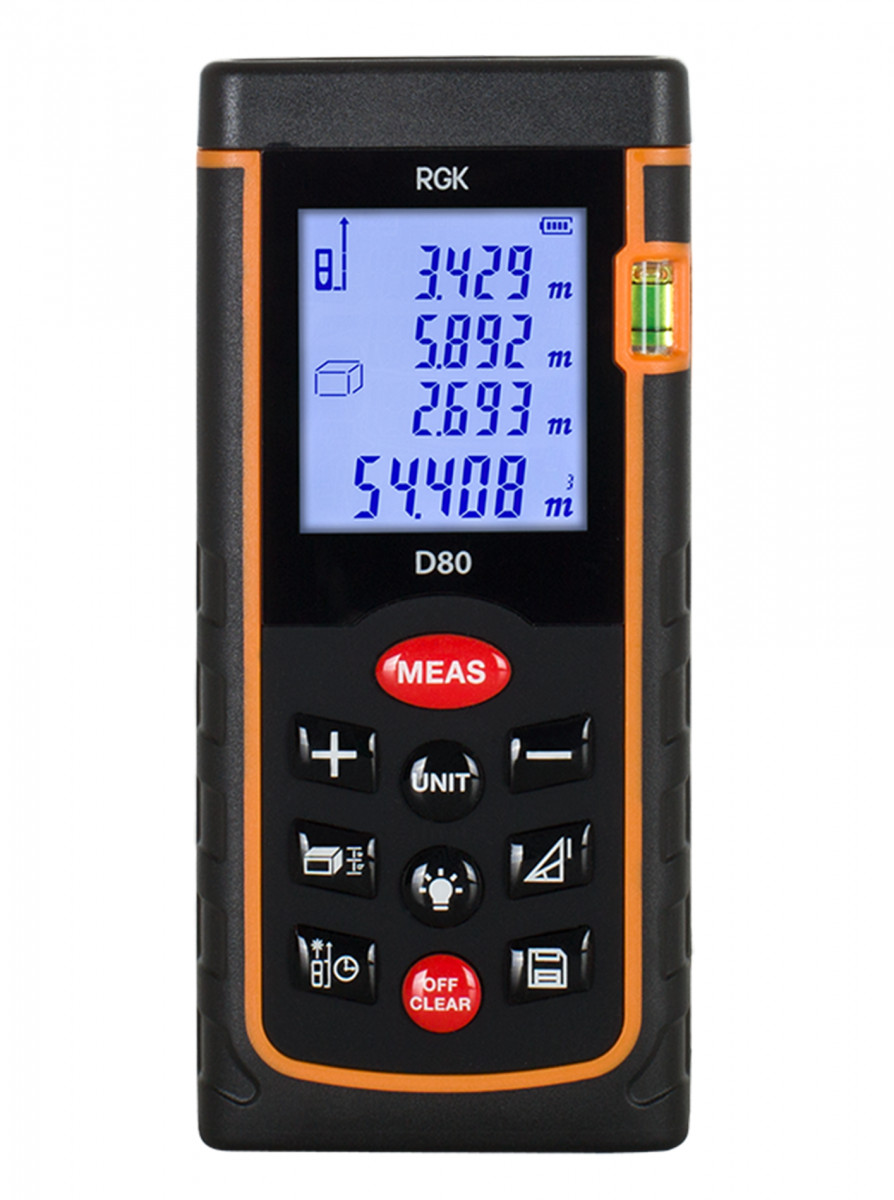 Лазерный дальномер RGK D80 – современный прибор профессионального уровня, предназначенный для измерения расстояний в помещении и на улице. Диапазон измерений – до 80 метров, точность при этом составляет ± 2 мм. Функционал Широкий набор функций лазерного дальномера RGK D80 существенно упрощает и ускоряет процесс измерений: Расчёт периметра, площади и объёма помещения. Функция Пифагора поможет измерить недоступные расстояния. Непрерывные измерения. Данная функция позволит отмерить необходимое расстояние до объекта или произвести вынос точек. Определение минимума и максимума поможет, например, при измерении диагоналей или расстояний до нескольких объектов. Сложение и вычитание избавит вас от необходимости производить расчёты в уме или использовать калькулятор. Внутренняя память Результаты измерений сохраняются во внутренней памяти лазерного дальномера RGK D80 – до 99 значений. Просмотреть их можно непосредственно на экране самого прибора. Это существенно упрощает анализ полученных значений. Точки отсчёта При