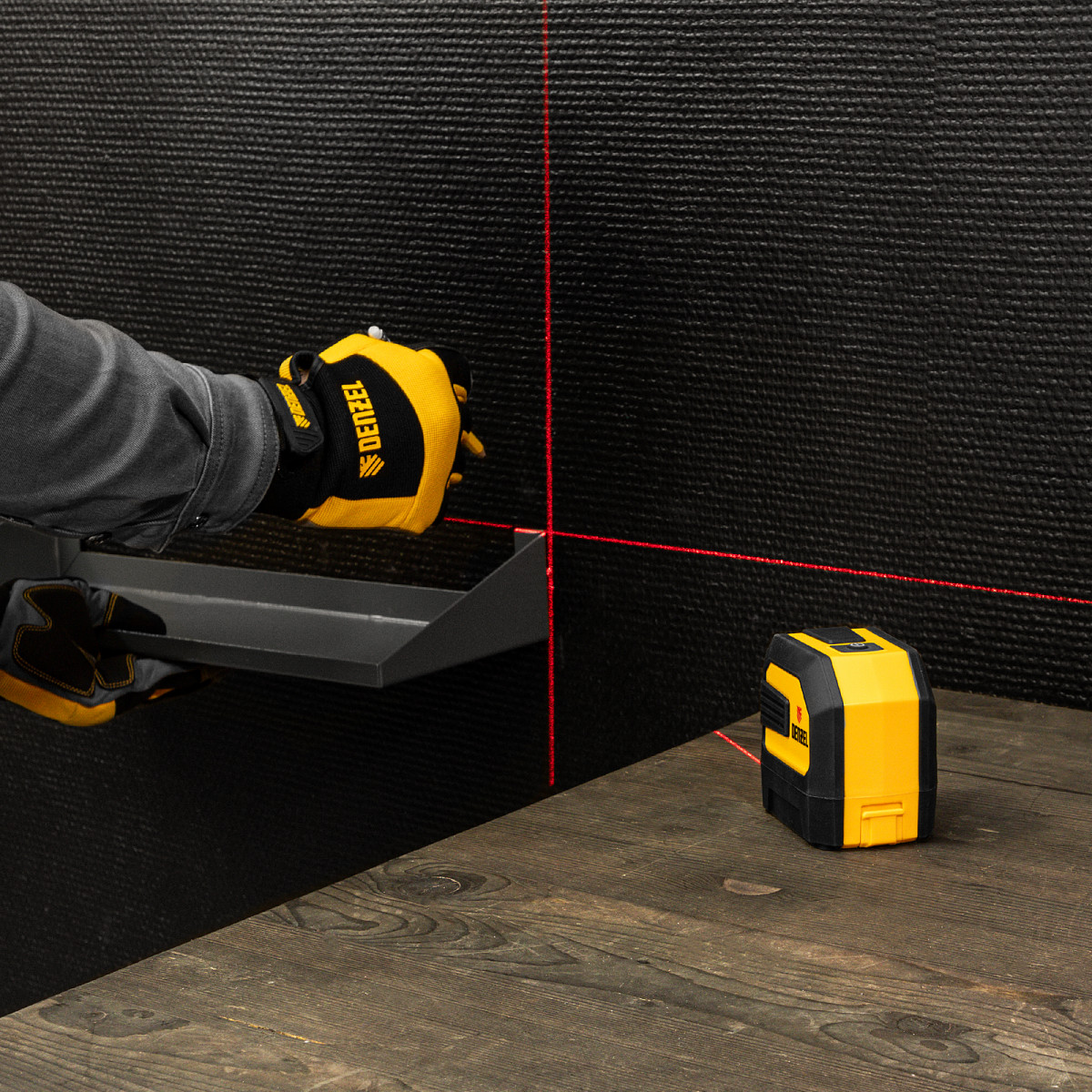Лазерный уровень Denzel LX 02 35056 с резьбой 1/4" под штатив имеет точность ±0,3 мм/1 м и проецирует вертикальную и горизонтальную линию на расстояние до 20 м при помощи красных лучей 635 нм. Используется для построения разметки на стенах, полу и потолке. Пригодится во время укладки плитки, монтажа подвесных потолков, установки оконных рам, а также проведения других ремонтных и отделочных работ.