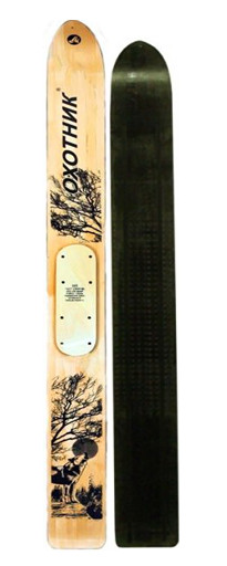 Лыжи «Охотник» применяются практически на всей территории России, кроме некоторых южных регионов. Они изготовлены из древесины лиственных пород (береза, осина). Склейка лыж «Охотник» произведена морозо- и влагоустойчивым клеем шведского производства, что придает лыжам особую прочность. Покрытие лицевой стороны данных охотничьих лыж выполнено финским морозоустойчивым лаком с повышенным глянцем. В пластиковых охотничьих лыжах на скользящей поверхности применяется полиэтилен низкого давления, что предотвращает быстрое истирание нижней части лыжи. Это преимущество позволяет использовать их по насту. Также в теплую погоду снег не налипает на пластик, что предопределяет использование данного вида лыж в температурном интервале от +5 С до -10 С. При более низких температурах дерево-пластиковые охотничьи лыжи малоэффективны. Для наилучшего скольжения, перед применением, пластиковые лыжи необходимо проциклевать и смазать парафином. Ширина 150 мм.