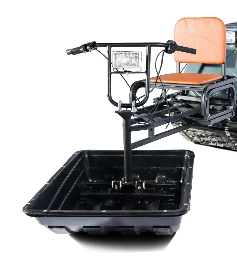 Новинка - универсальный толкач для мотобуксировщиков с передним и задним приводом. Подходит на базу длиной 1250 и 1450 мм на гусенице шириной 500 мм. Данная опция значительно повышает проходимость мотобуксировщика по глубокому снегу и пухляку. Волокуша уплотняет снег перед гусеницей, фактически прокладывая путик перед мотобуксировщиком.
