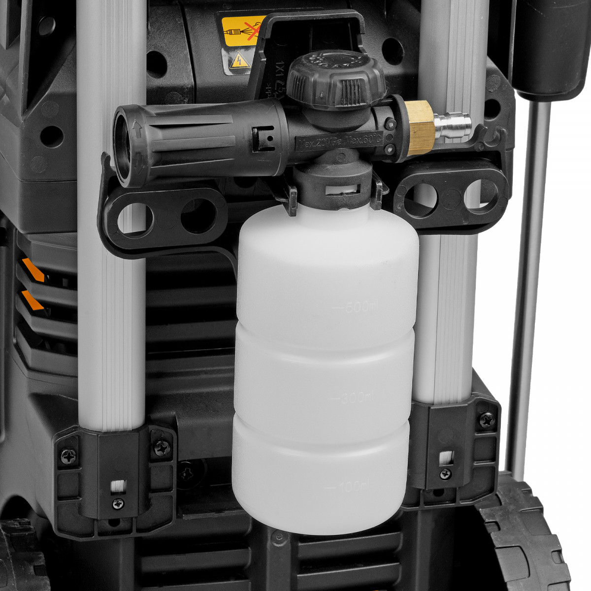• Максимально эффективное очищение — к мойке прилагается внешний пенокомплект с функцией улучшенного пенообразования, быстросъемное крепление позволяет устанавливать его на пистолет одним движением.