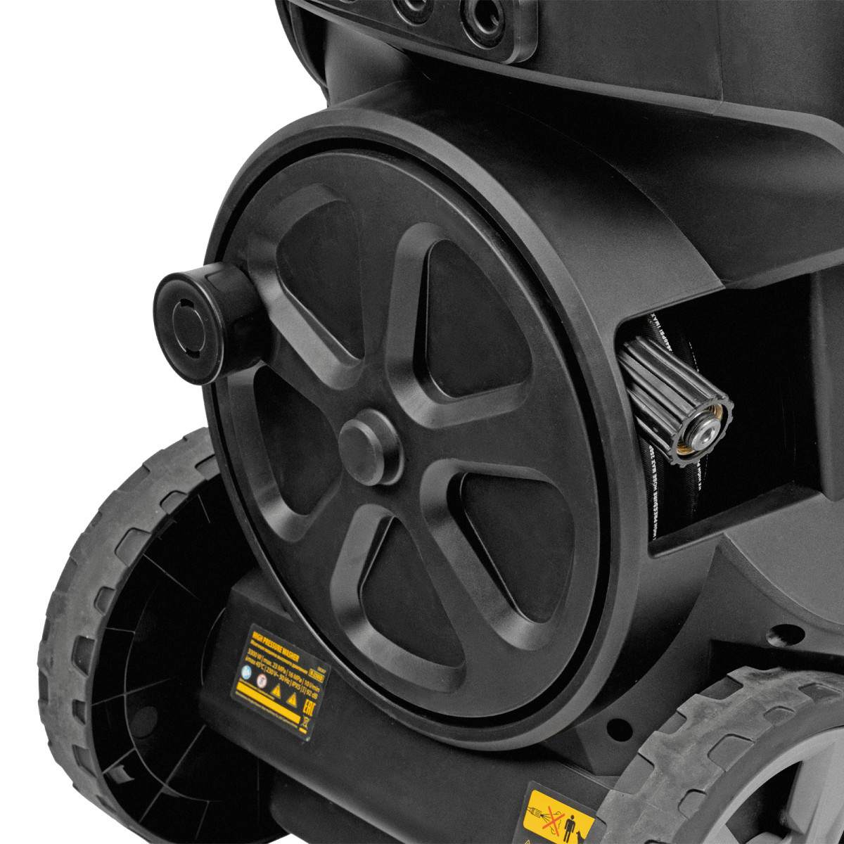 - Продуманная конструкция — функциональный барабан для хранения шланга позволяет наматывать шланг без его отключения от мойки.