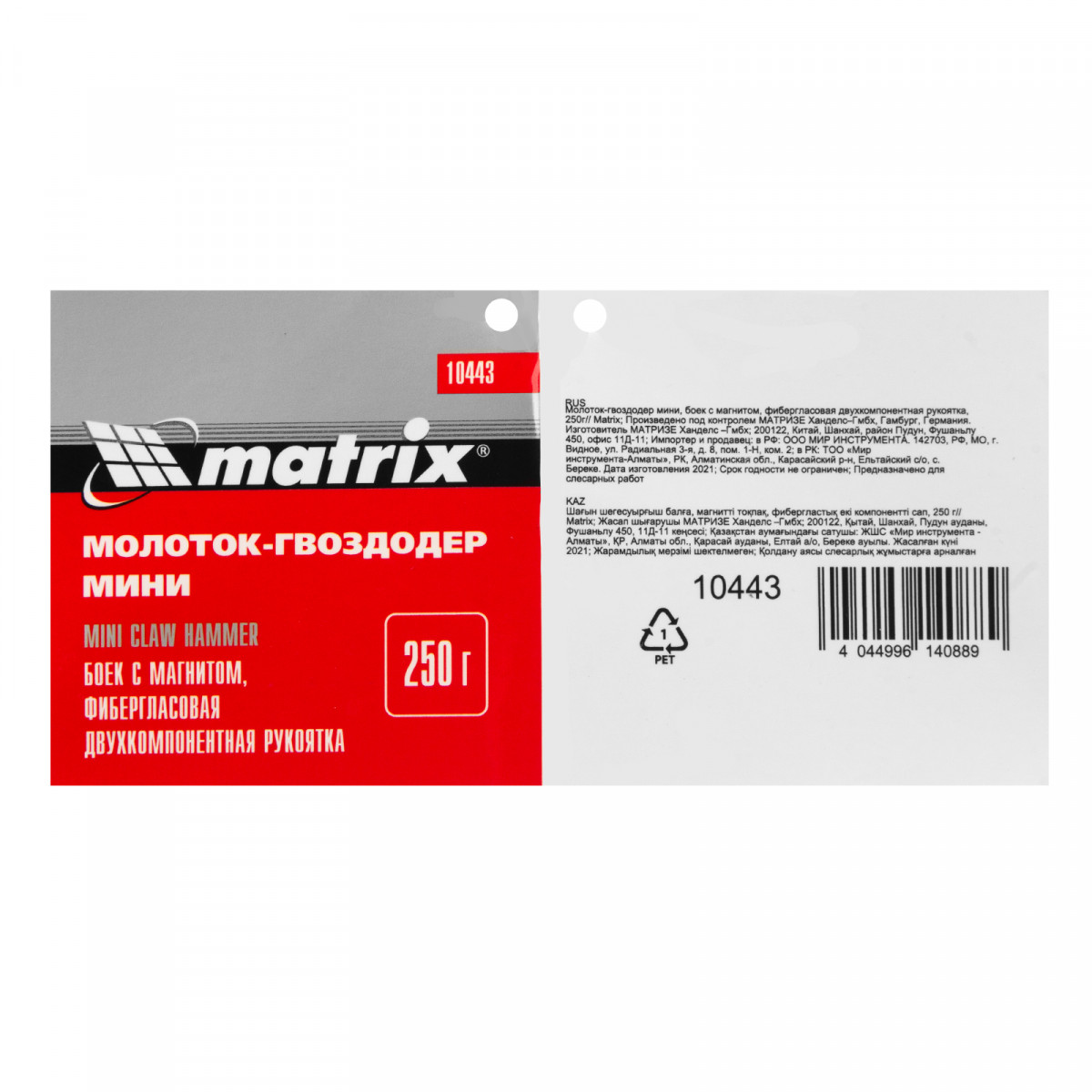 Молоток-гвоздодер мини, боек с магнитом, фибергласовая двухкомпонентная рукоятка, 250 г Matrix