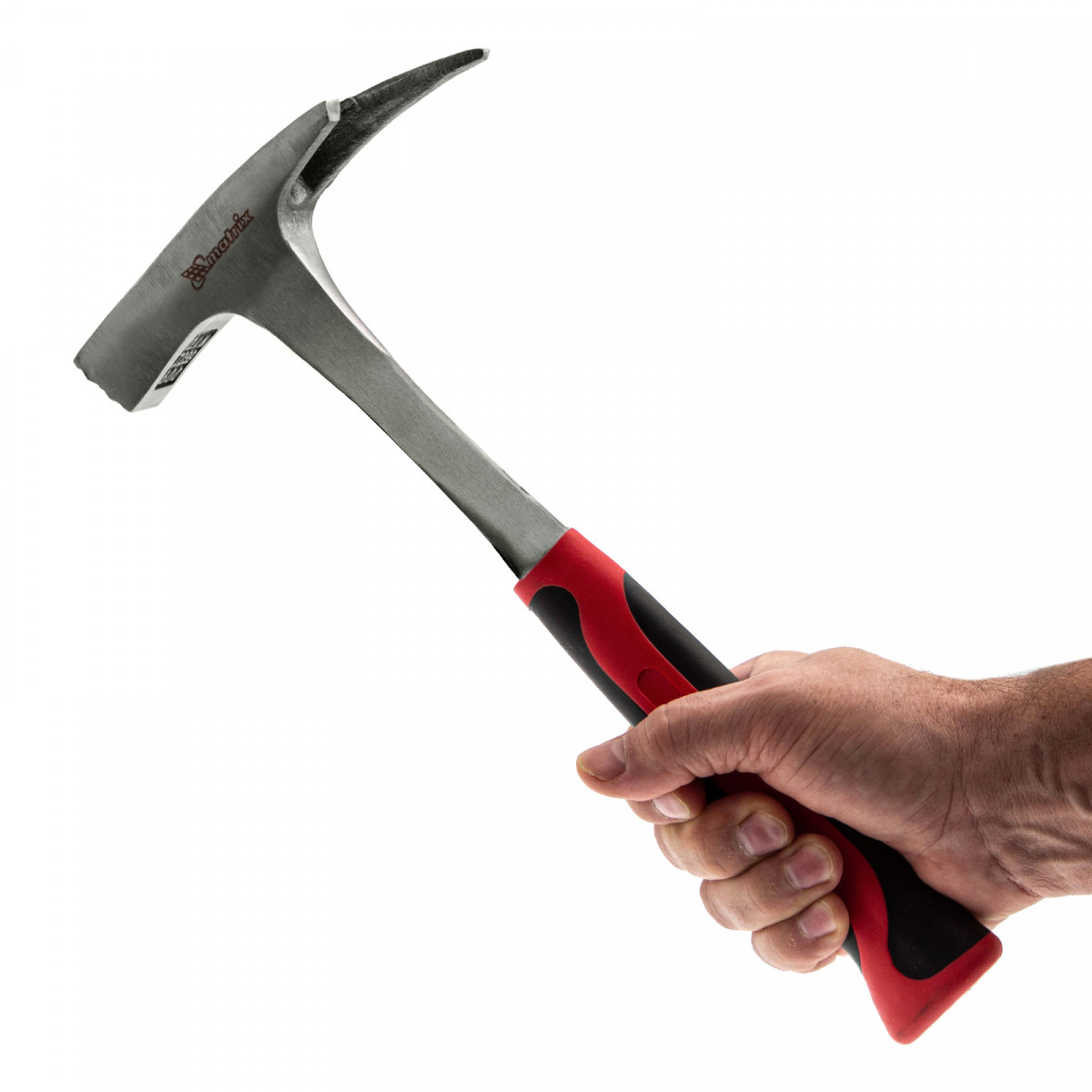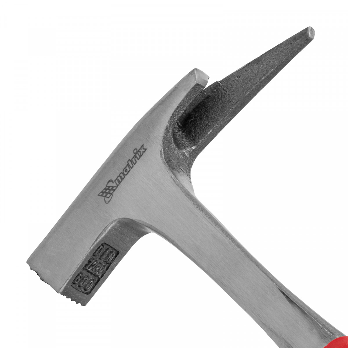 Цельнометаллический молоток кровельщика Matrix 10620 с головкой весом 600 г и двухкомпонентной рукояткой — специализированный инструмент для кровельных работ. Насечки на рабочей поверхности бойка предотвращают соскальзывание, если удар по гвоздю нанесен под углом. Противоположная часть головки представляет собой заостренный клин для пробивания отверстий в листовом металле и отгибания кромок. Гвоздодер позволяет вытягивать неправильно забитые гвозди для их выпрямления.