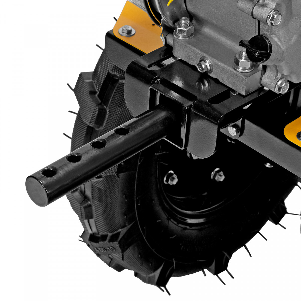 • Эффективная работа — благодаря усиленному шестеренчато-цепному редуктору с чугунным корпусом мотоблок успешно справляется даже с плотным, глинистым грунтом.