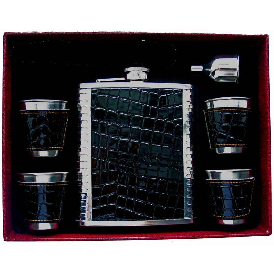 Подарочный набор для мужчин состоит из большой фляжки, 4 стаканчиков и воронки.