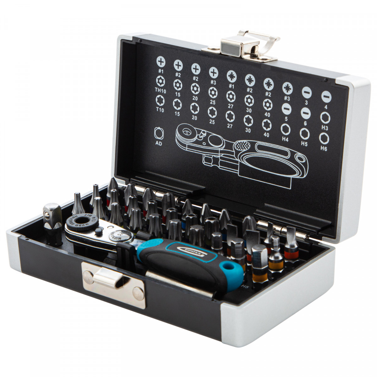 - Широкая комплектация — набор включает биты PH 1-3, PZ 1-3, Sl 3-6, TORX и TORX Tamper 10, 15, 20, 25, 27, 30, 40, HEX 3-6.