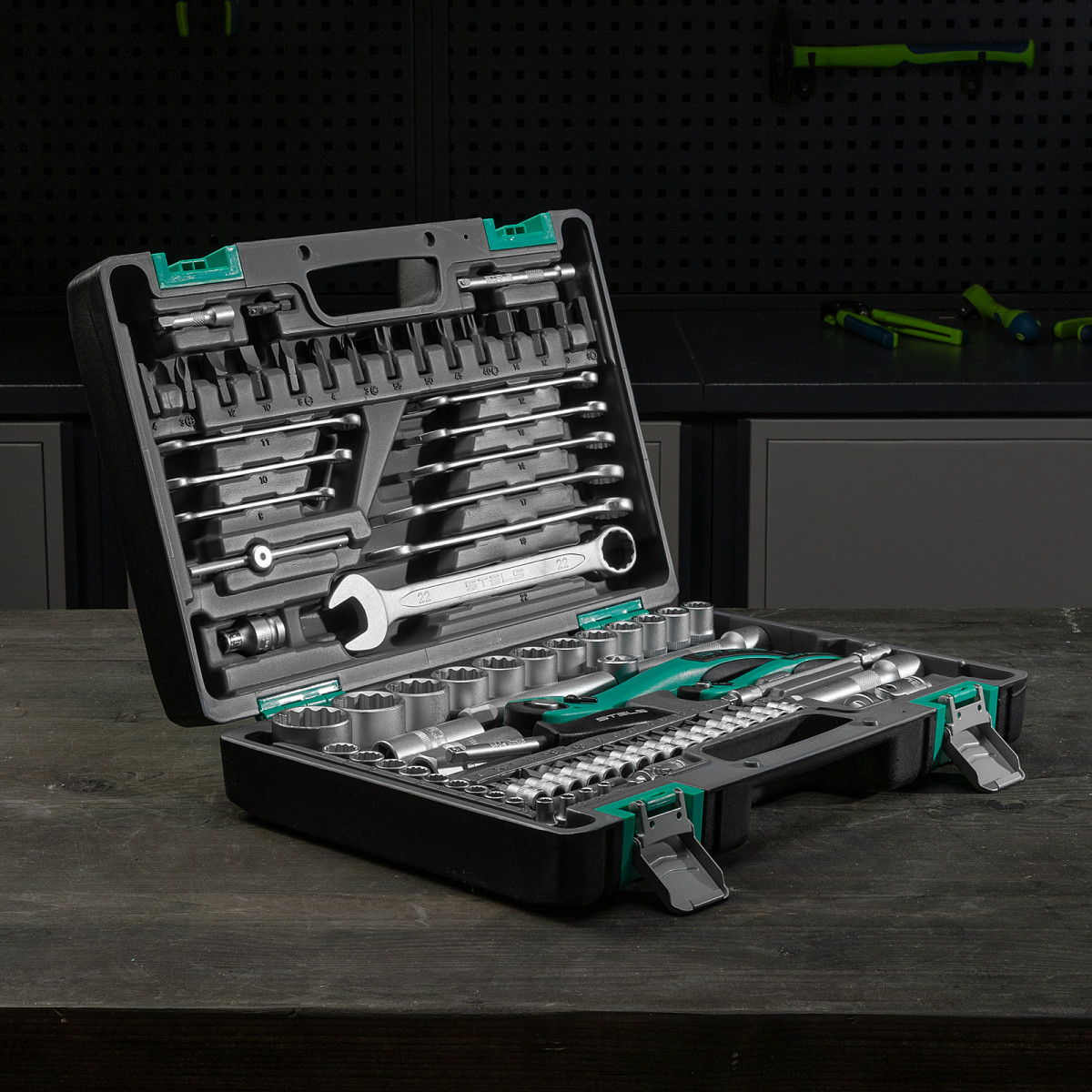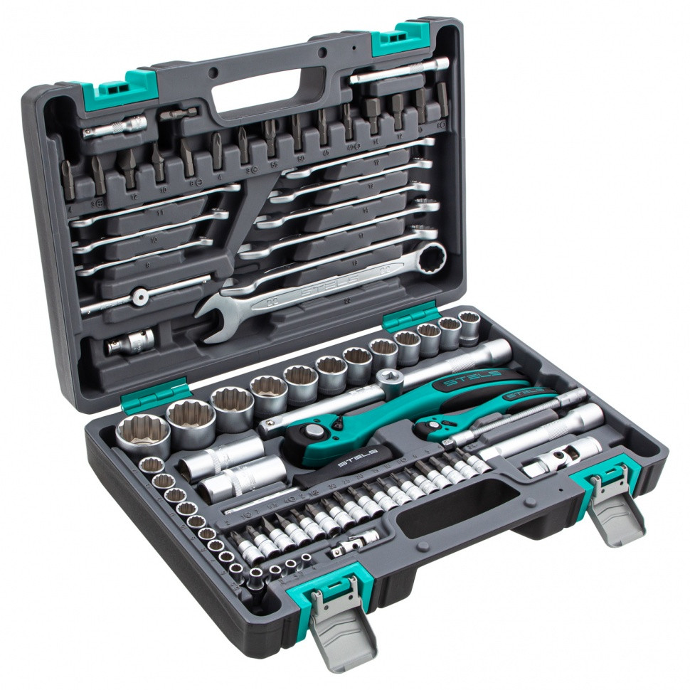 Набор инструментов Stels 14117 в ударопрочным пластиковом кейсе состоит из 82 предметов с присоединительными квадратами 1/2″ и 1/4″, из стали CrV и S2, и предназначен для выполнения слесарно-монтажных работ. Включает инструменты и насадки для работы с резьбовыми крепежами, в том числе 12-гранные торцевые головки, т-образный вороток и удлинители (в том числе гибкий), облегчающие работу в труднодоступных местах. Набор предназначен для профессионального использования в автомастерской, будет полезен и для решения бытовых задач.