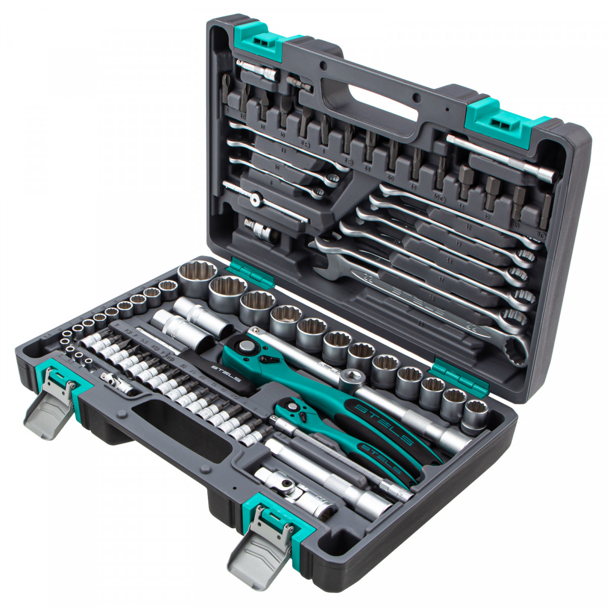 Набор Stels 14117 из 82 предметов включает инструменты и насадки для работы с резьбовыми крепежами, в том числе 12-гранные торцевые головки, облегчающие работу в труднодоступных местах. Комплект упакован в кейс из ударопрочного жесткого пластика с металлическими застежками, удобный для хранения и перевозки. Набор предназначен для ремонта автомобилей в гараже или автосервисе, пригодится также дома, на даче или в поездке.