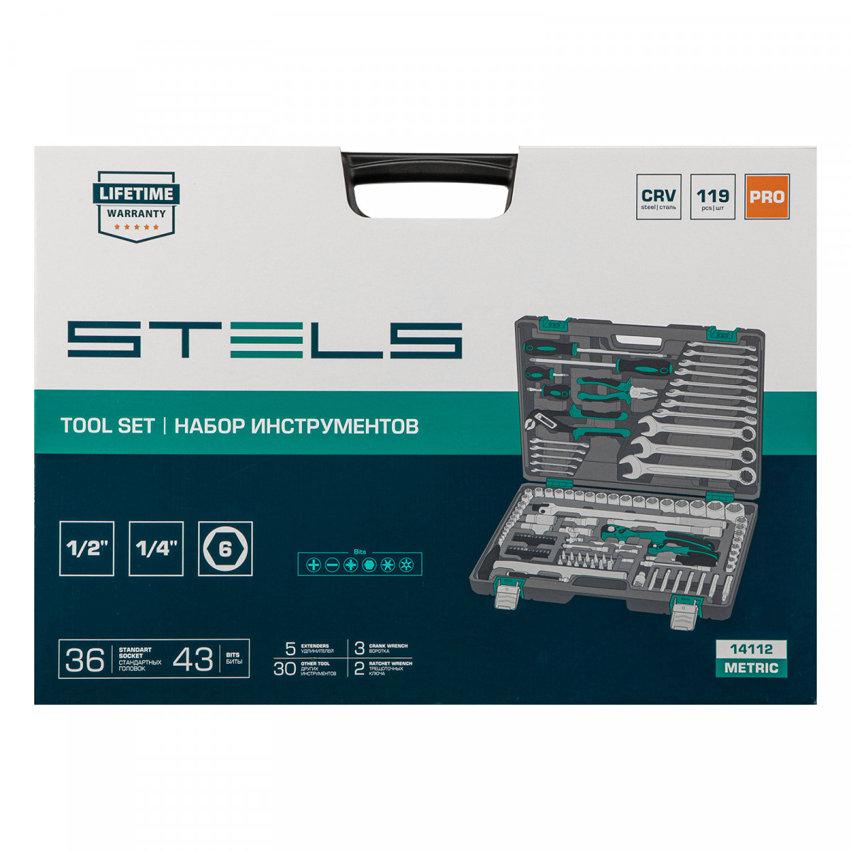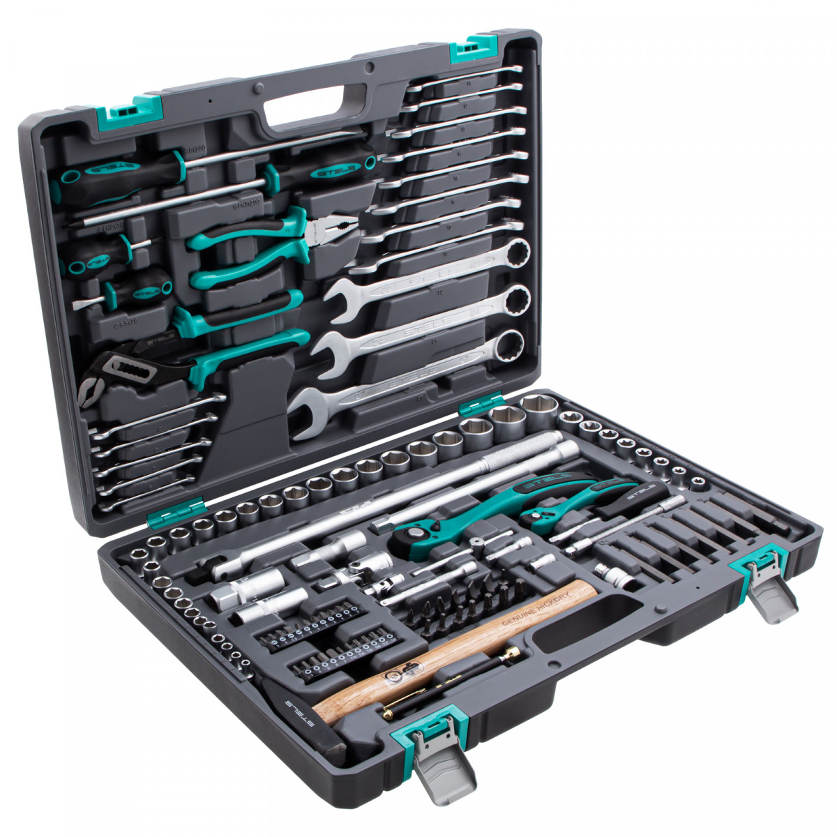 Набор инструментов Stels 14112 в ударопрочным пластиковом кейсе состоит из 119 предметов с присоединительными квадратами 1/2″ и 1/4″, из стали CrV и S2, и предназначен для выполнения слесарно-монтажных работ. Включает инструменты и насадки для работы с резьбовыми крепежами, а также удлинители (в том числе гибкий) и воротки, облегчающие работу в труднодоступных местах. Молоток, плоскогубцы и переставные клещи расширяют возможности использования набора. Набор предназначен для профессионального использования в автомастерской, будет полезен и для решения бытовых задач.