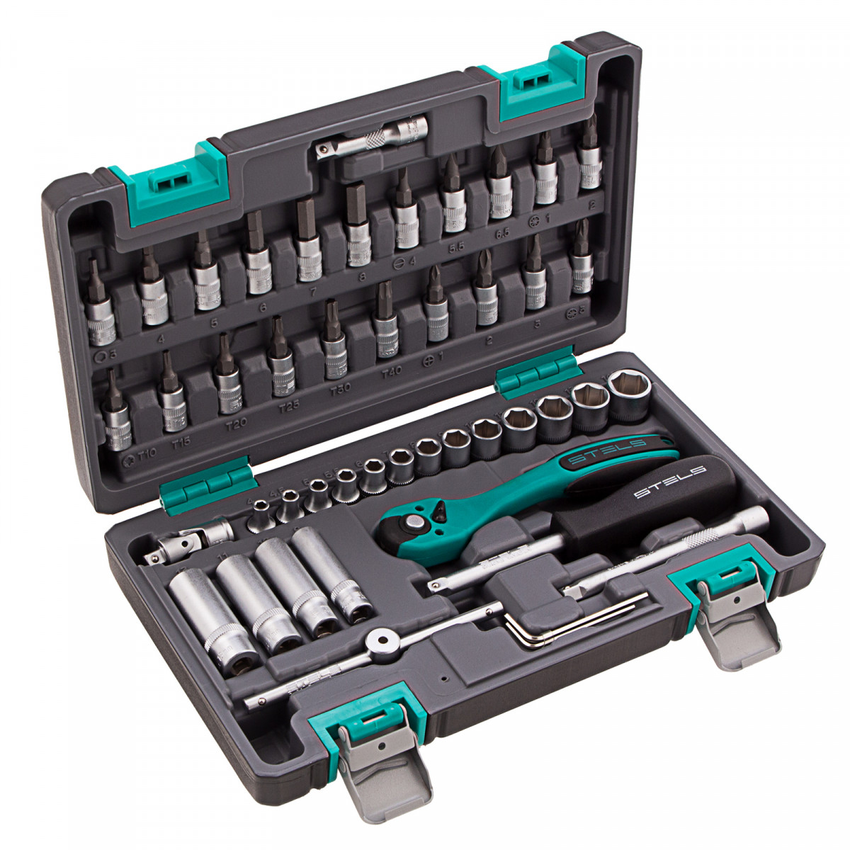 Набор инструментов Stels 14099 в ударопрочным пластиковом кейсе состоит из 47 предметов с присоединительным квадратом 1/4″, из стали CrV и S2, и предназначен для выполнения слесарно-монтажных работ. Включает инструменты и насадки для работы с резьбовыми крепежами, а также удлинители и т-образный вороток, облегчающие работу в труднодоступных местах. Набор предназначен для профессионального использования в автомастерской, будет полезен и для решения бытовых задач.