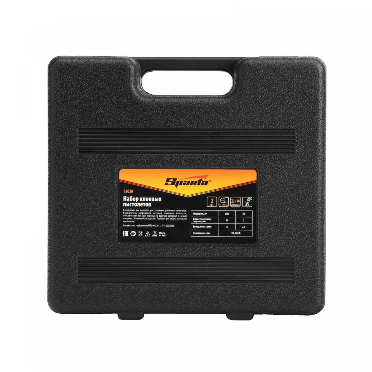 Набор Sparta 93038 в кейсе включает 2 клеевых пистолета с выключателями, мощностью 20/100 Вт, производительностью 3 и 8 г/мин, совместимых со стержнями диаметром 7 и 11 мм. Их используют для проведения несложных бытовых работ: склеивания бумаги, дерева, пластика и других материалов. Инструменты пригодятся частным мастерам при мелком ремонте, упаковке, сборке различных моделей и рукоделии.