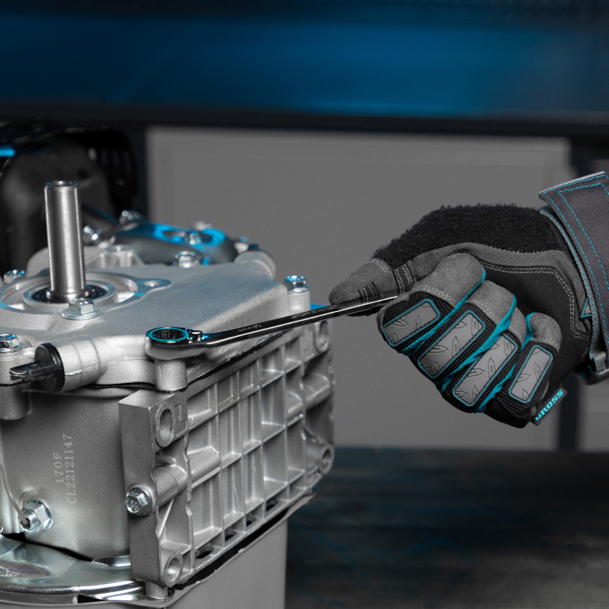 Набор комбинированных реверсивных ключей с трещоткой Gross 14892 используется для монтажа и демонтажа болтов и гаек и включает 7 инструментов размером от 8 до 19 мм, выполненных из стали CrV. Каждый из них имеет две рабочие головки — рожковую и накидную, что расширяет возможности применения. У накидной головки 12-гранный профиль, благодаря чему она надежно захватывает крепеж. Наличие реверса упрощает работу с резьбовыми соединениями. Набор подходит как для профессионального, так и для самостоятельного ремонта автомобилей.